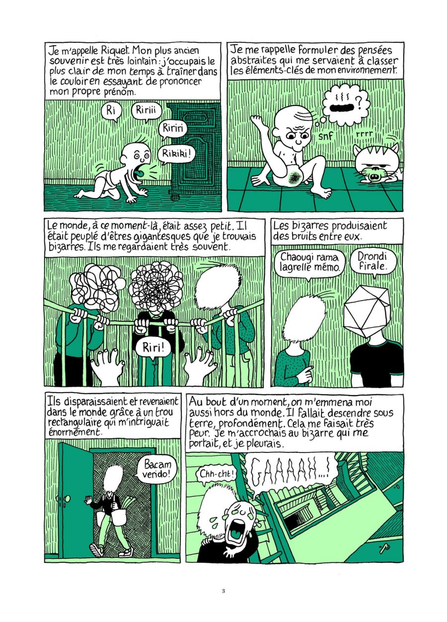 Théo Grosjean commence une série qui mélangerait l'autobiographie et la fiction. Je n'ai aucune idée ce qui est inventé ou non dans ce premier tome et j'avoue que je m'en fous un peu. J'ai trouvé le résultat moyen avec des bons et des moins bons moments. Parfois, je ne comprenais pas les intentions de l'auteur comme le fait que pendant un moment le visage du père est différent du reste de la famille jusqu'à ce que le petit dernier se rends compte que son père a un visage comme les autres. On suit donc Riquet, le dernier enfant d'une famille un peu dysfonctionnelle où le père est gendarme et la mère très religieuse. L'action se passant lorsque j'étais moi-même enfant, je me suis reconnu dans certaines situations. Le fait que le père est gendarme permet de découvrir un peu se métier, mais je ne pense pas avoir appris grand chose de nouveaux et je doute que plusieurs lecteurs de voir qu'il y a du machisme et du racisme dans ce milieu. Je comprends pourquoi Riad Sattouf a publié cette série dans sa maison d'édition parce que le travail de Grosjean ici rappel son propre travail et au déprimant de cette série. En effet, on dirait du Sattouf, mais en moins maitrisé. Ça se laisse lire et il y a des bons moments, mais ce n'était pas palpitant à lire.