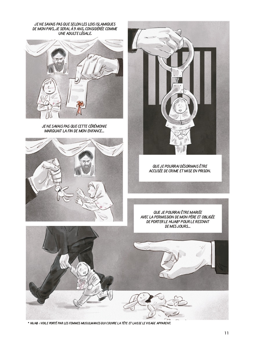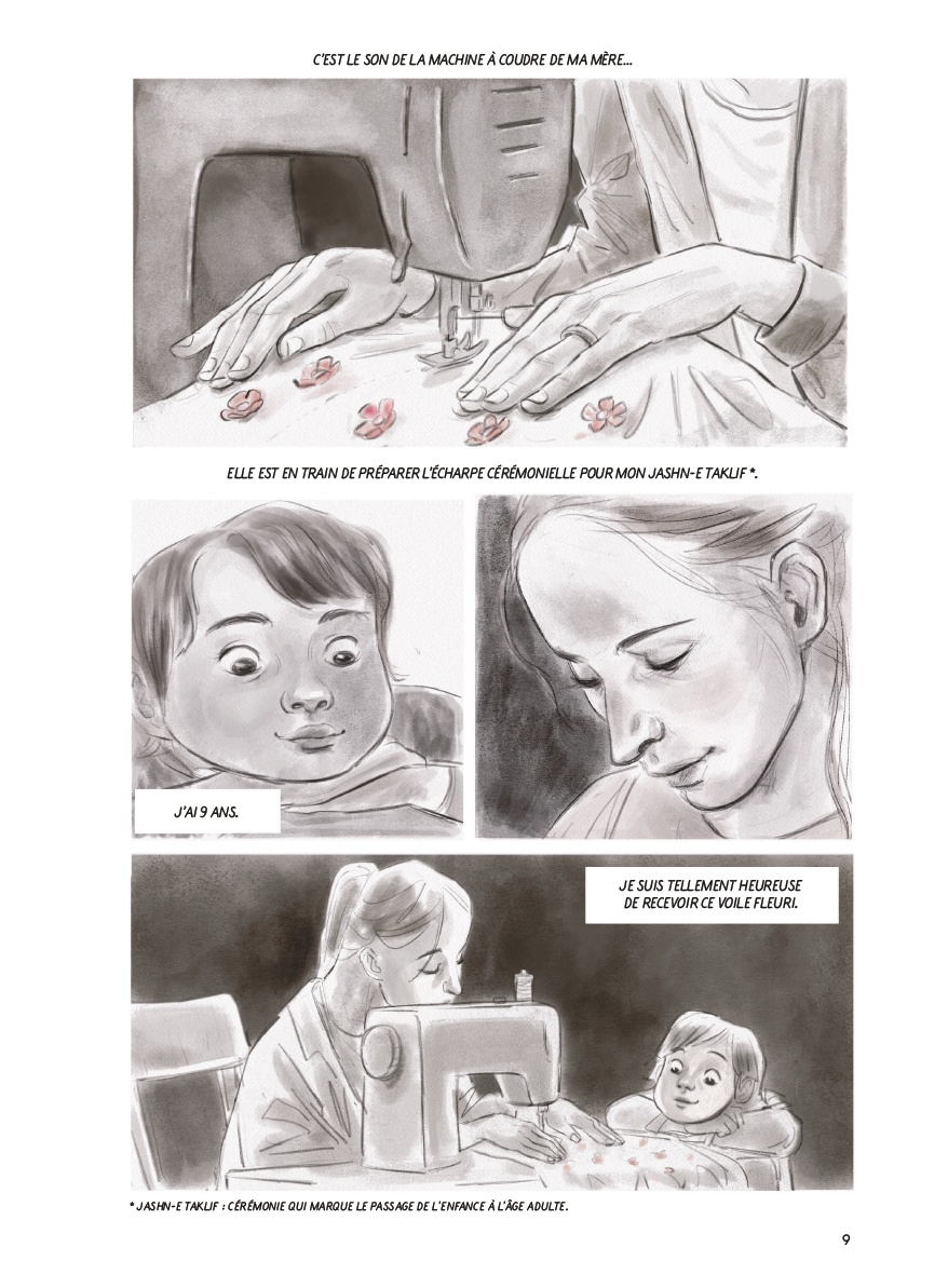 Elle expose des faits : les interdictions multiples (rire, chanter, danser, aimer), la possibilité d’être mariée à 9 ans, exécutée à 15, après avoir été violée... Elle raconte les agressions sexuelles répétées, dans la rue, le taxi, chez le médecin, à la fac... Et la peur constante, l’impuissance, l’incapacité à maîtriser son destin. Mais Mansoureh a fuit l’Iran, elle a réussi à sortir de cette oppression permanente, et cet album est aussi l’histoire d’une métamorphose, celle d’une femme recouvrant sa liberté.