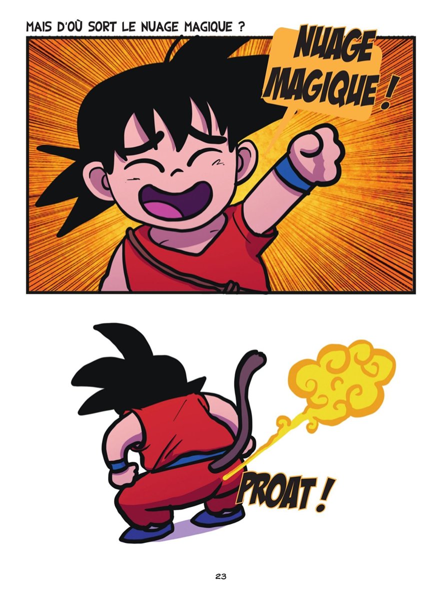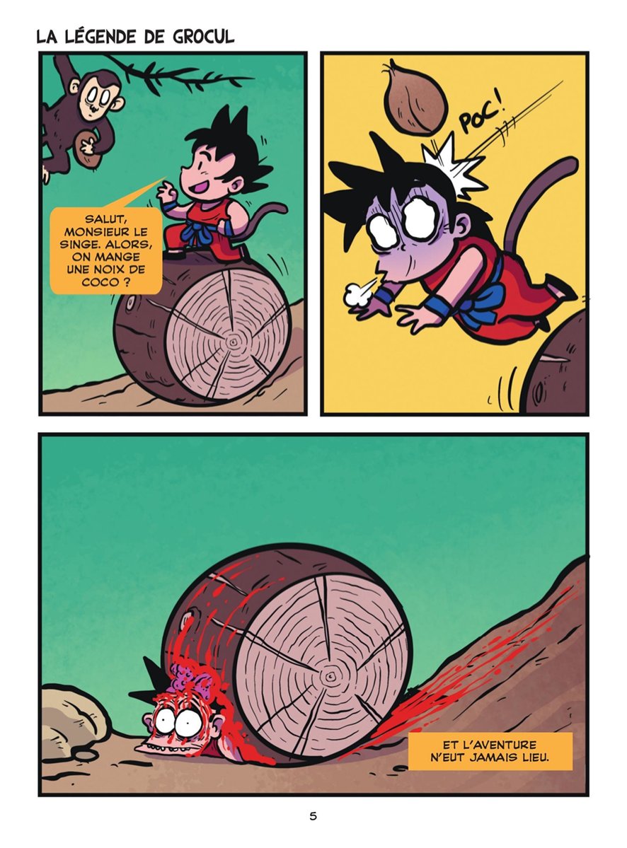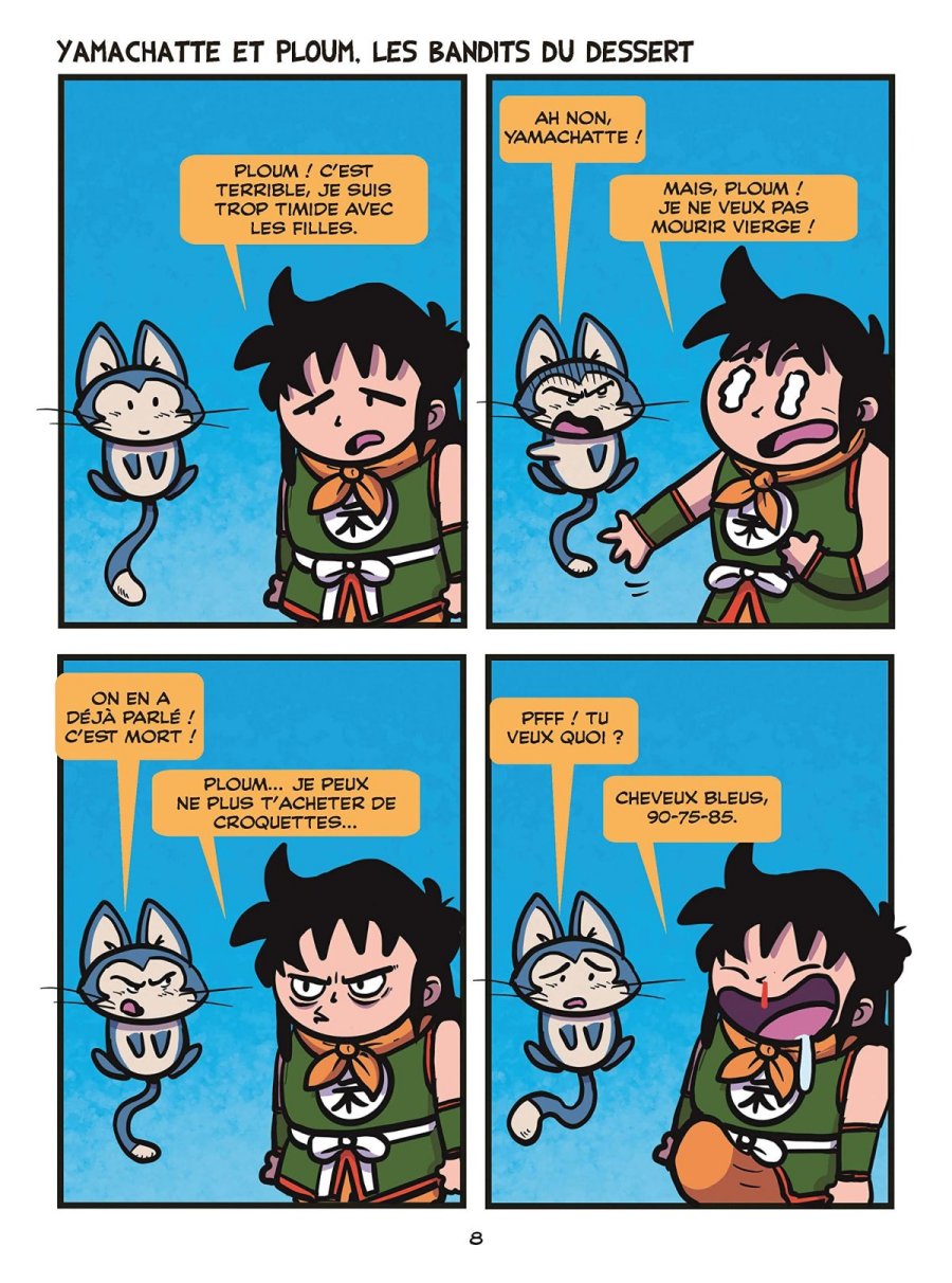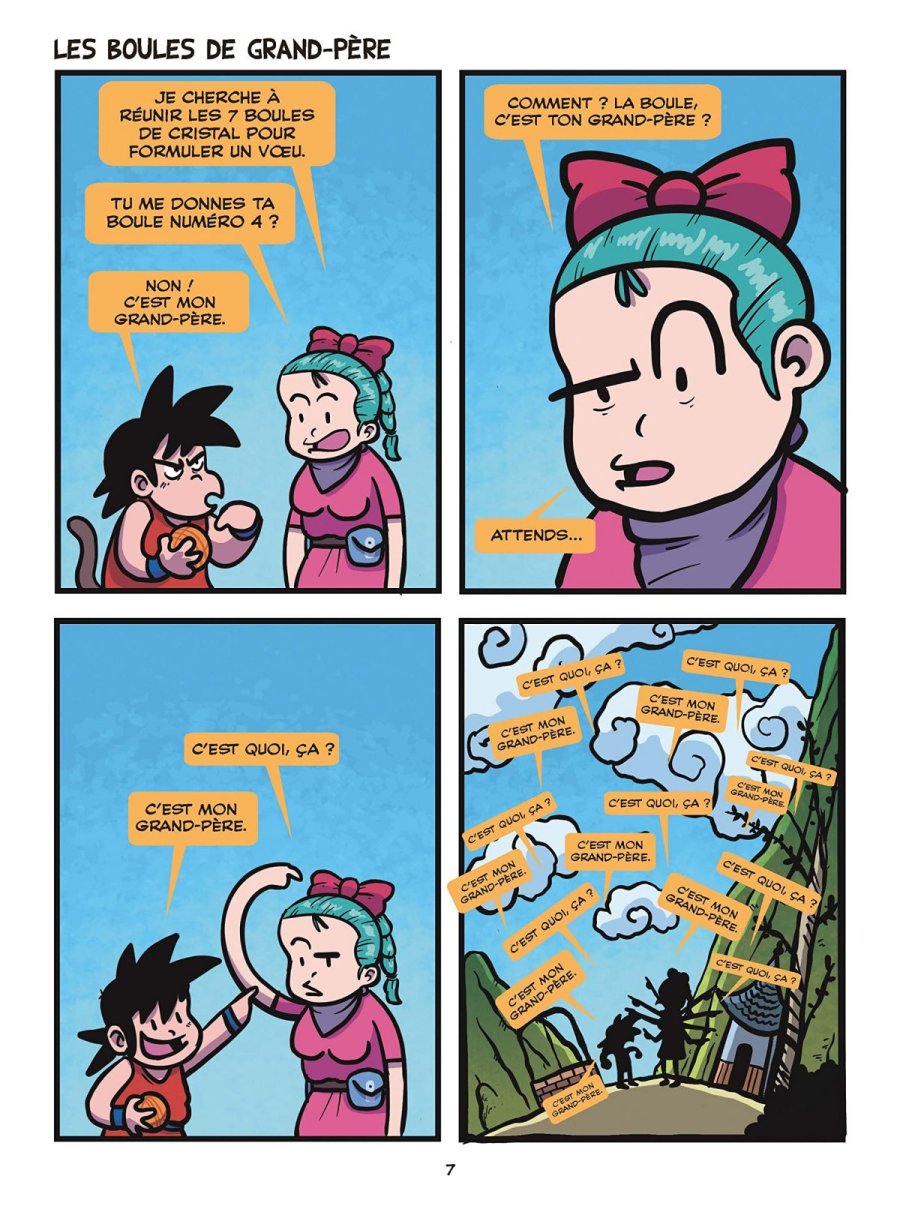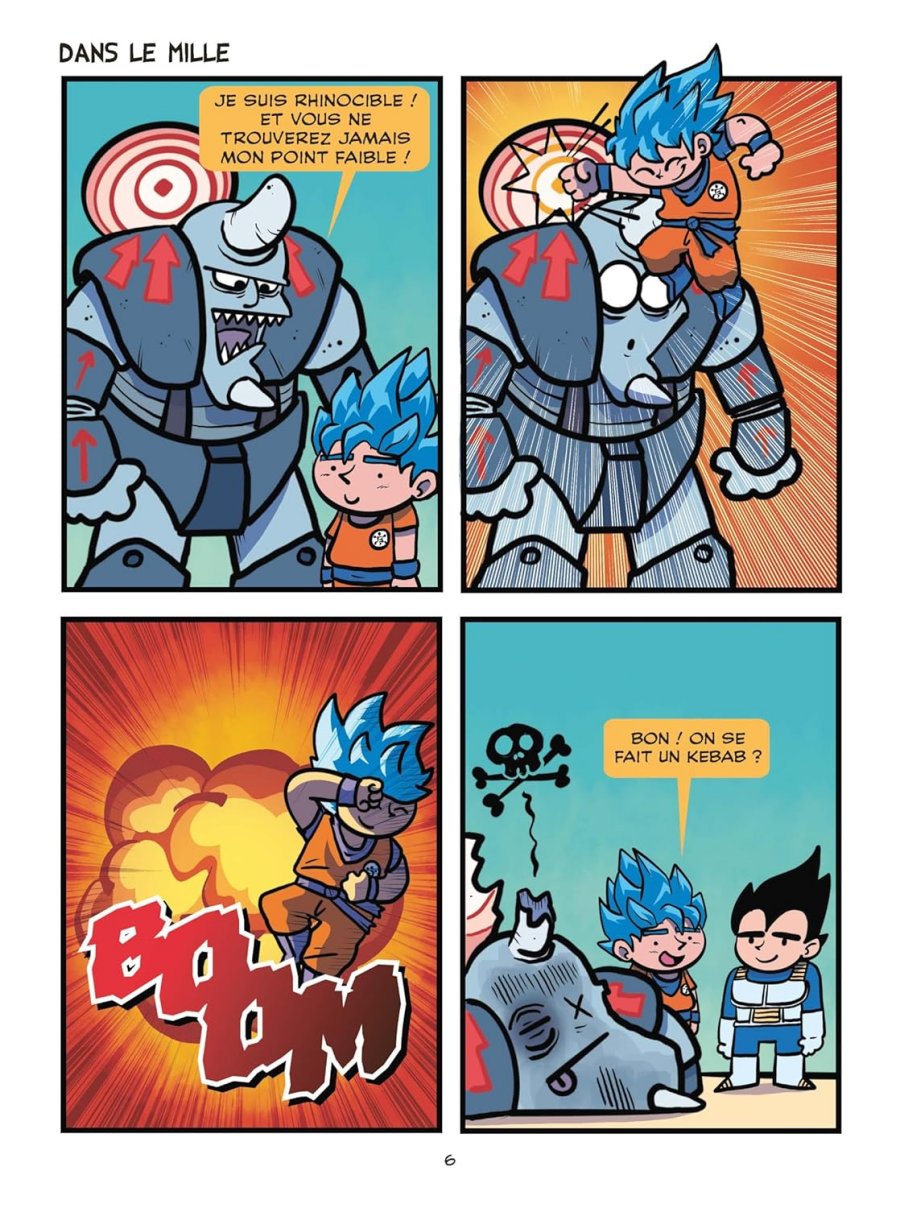 A raison d'un strip en quatre cases maximum par page, le premier tome parodie la série Dragon Ball complète du tout début de Dragon Ball à la fin de DBS. Quant au second tome, il rallonge la sauce avec des gags autour d'un tournoi d'arts martiaux là encore dans l'esprit de DBS. Cette série s’adresse clairement à un public qui connaît l’intégralité de l’univers Dragon Ball (DB, DBZ, OAV, GT et Super compris), car une grande partie des gags repose sur des clins d’œil et des détournements de personnages ou de situations qui deviennent incompréhensibles sans des références parfois très précises. En ce sens, c’est une parodie très communautaire. Le dessin et les couleurs sont propres, simples et efficaces, et s’accordent bien avec le registre parodique assumé de la série, qui reprend les codes du strip comics très court et rythmé, dans un esprit proche de ce qu’on peut retrouver sur les réseaux sociaux ou dans des formats humoristiques très condensés. Malgré cela, même en tant que connaisseur de la série originale, je n’ai pas du tout accroché. J’ai trouvé l’humour bas de plafond, souvent lourdingue, et trop fréquemment basé sur des ressorts pipi-caca-prout ou des blagues volontairement grotesques mais sans finesse. Il m’est arrivé de sourire ou de pouffer sur une poignée de gags, mais cela reste extrêmement marginal, alors qu'au contraire j'étais navré de la nullité de la majorité des autres. Ils sont poussifs, voire franchement mauvais, avec un humour qui tombe à plat beaucoup trop souvent pour ne pas en avoir marre bien avant d'atteindre la moitié d'un album. L’ensemble donne davantage l’impression d’un délire potache entre initiés que d’une vraie parodie construite ou inventive. Visuellement, ça fait le travail pour ce type de format, mais cela ne suffit pas à compenser un humour affligeant. Il existe déjà énormément de parodies de Dragon Ball, et celle-ci, à mes yeux, est très loin de faire partie des plus réussies.