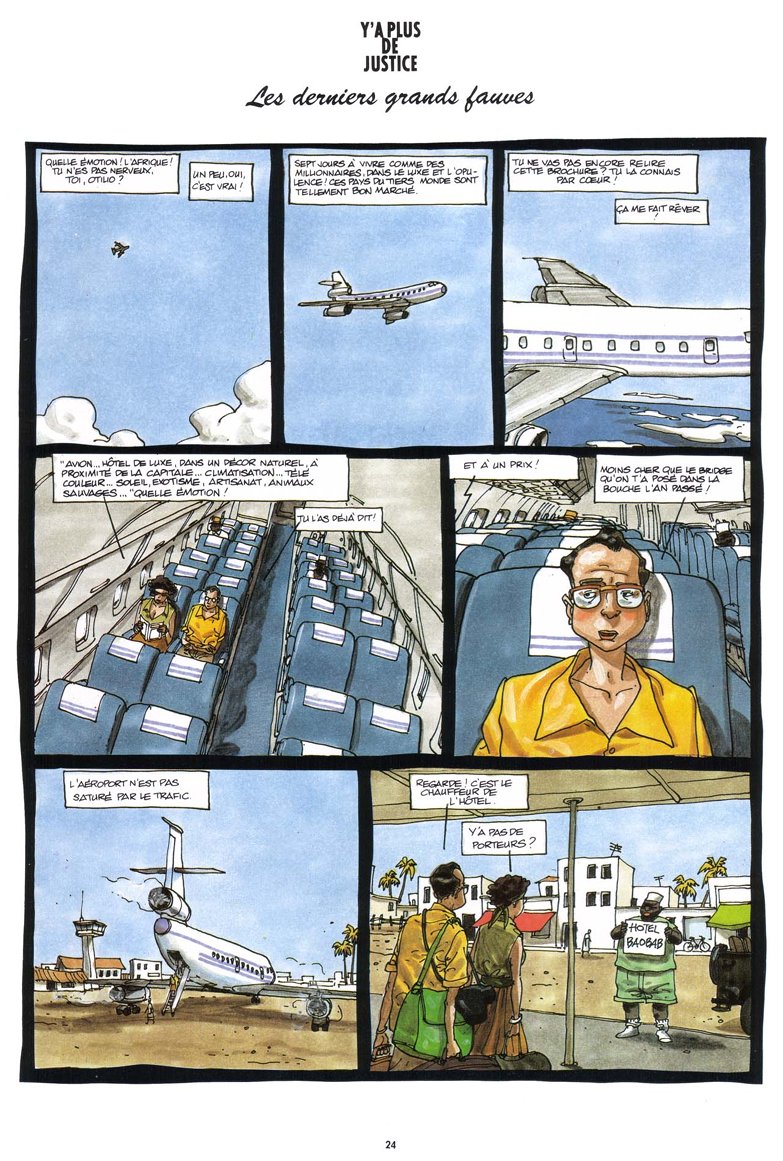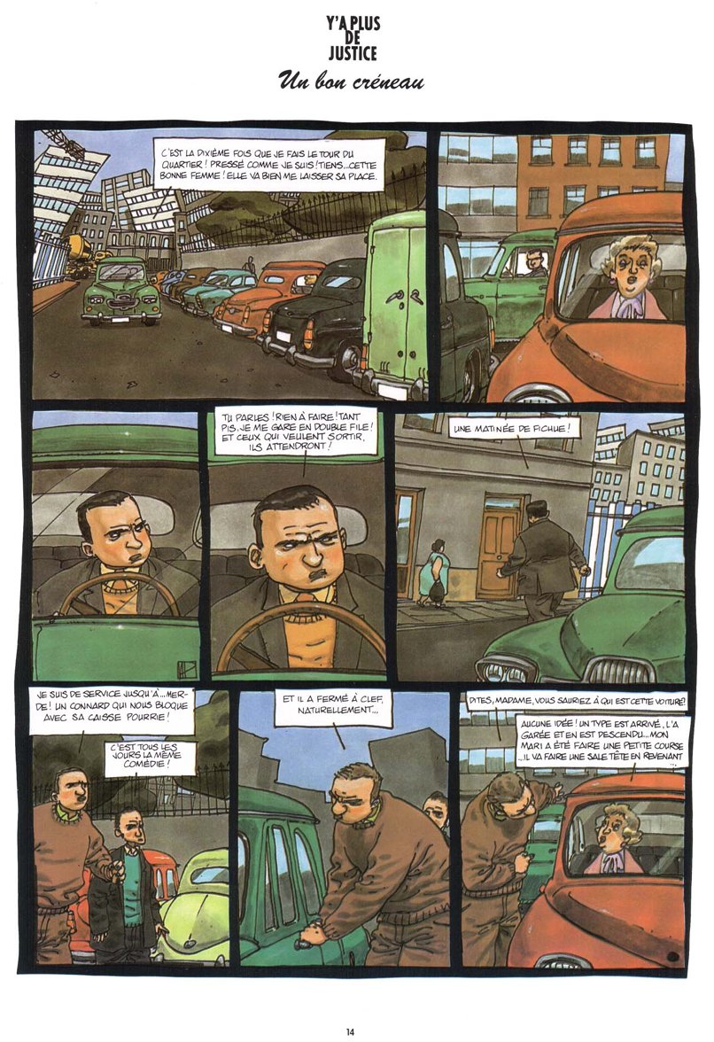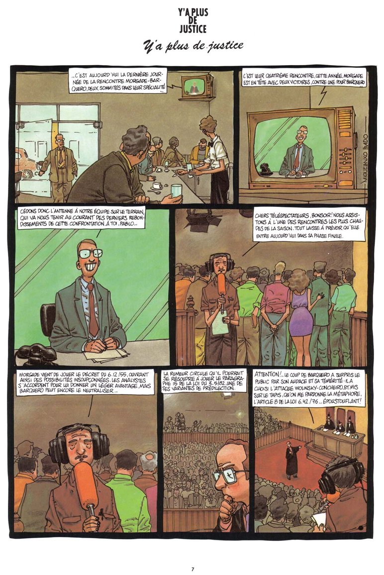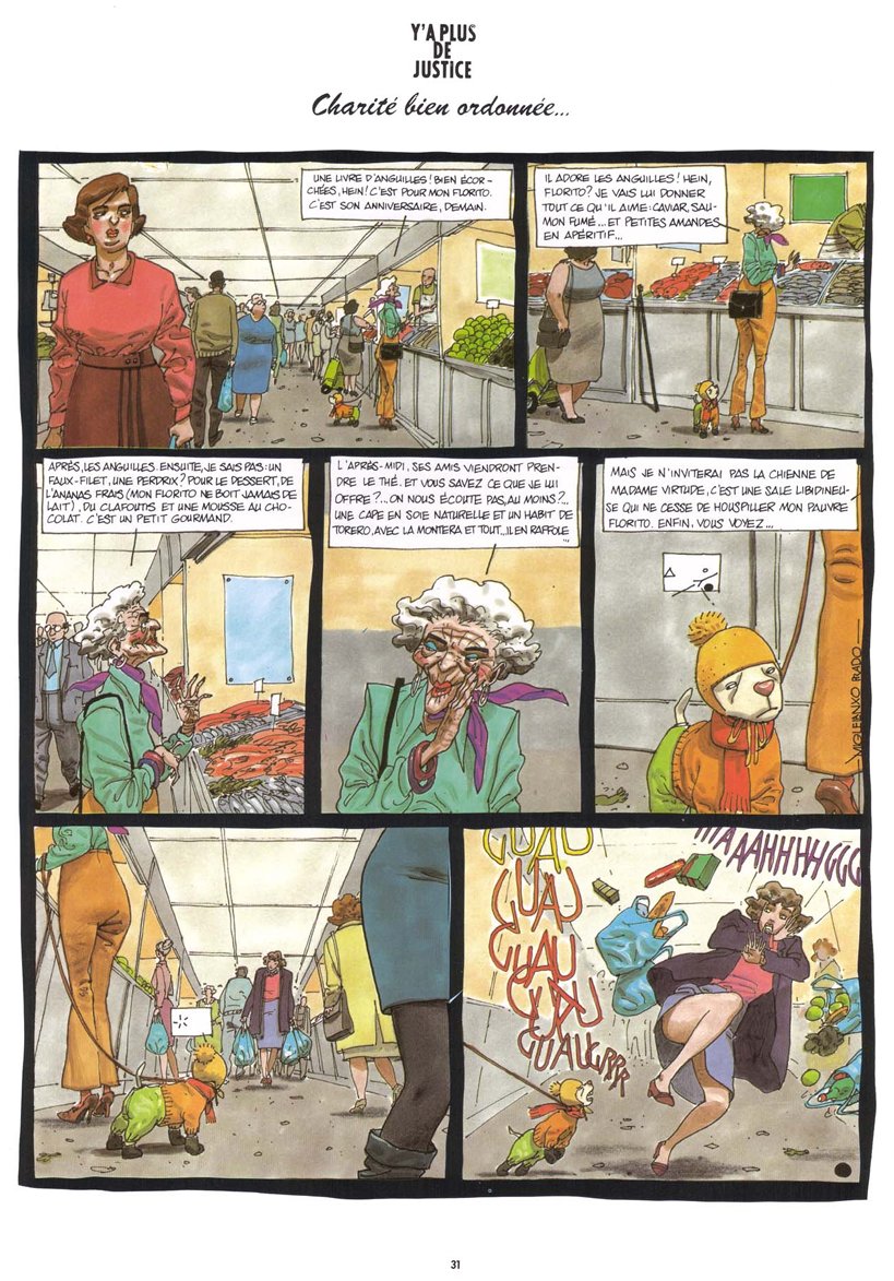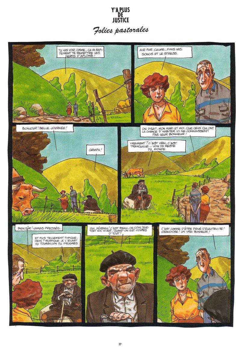 Pour Y’a plus de justice, je donne une mention spéciale à l’histoire du couple qui cherche à déstresser à la campagne et se retrouve pris sous le feu des règlements de comptes entre paysans du coin et aux soldats américains « forts » en géographie européenne et asiatique. En dehors de ça, Y’a plus de justice reste tout de même une BD plus que moyenne. L’introduction par cette histoire de procès racontée comme un combat de boxe est plutôt bien vue mais dans l’ensemble, même si je ne prétends pas que j’aurais pu développer ces sujets d’une autre manière (après tout, ce n’est pas mon métier non plus), je suis souvent arrivée à la fin de chaque petite histoire en me disant : « oui, bon, alors ? ». OK ça dénonce la justice grand spectacle, la médecine business, l’école mise à genou par les desiderata des parents d’élèves, la surenchère protectionniste de certaines professions, la vente forcée et la société de consommation, la désertification des campagnes mais ça ne suffit pas pour vraiment interpeler, ça se contente de nous dire ce que l’on sait déjà. Le dessin est correct, en tous les cas pour de la BD humoristique, les mimiques et attitudes sont plutôt bien rendues avec une mise en couleur bien meilleure que ce qui peut exister parfois dans le genre. Une lecture agréable mais sans plus.