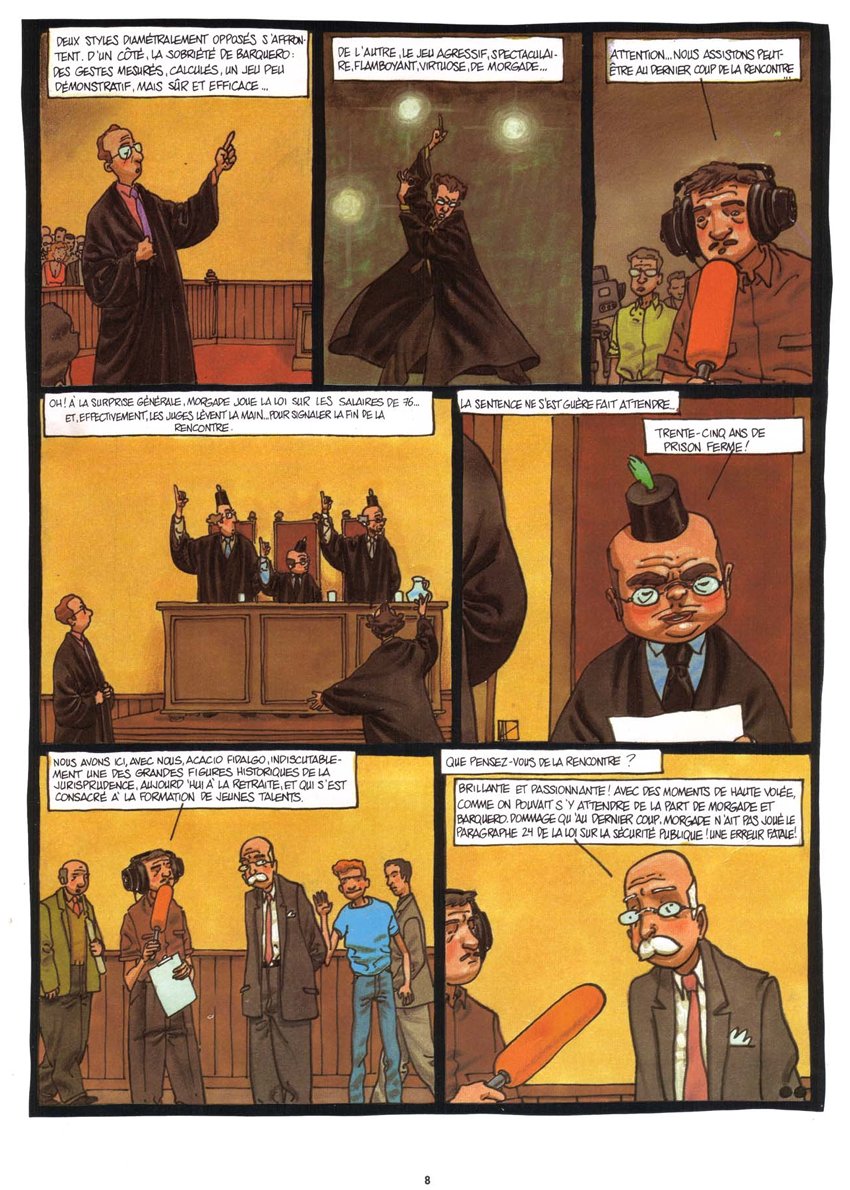(3.5/5) Petit coup de cœur car moi qui suis souvent hermétique à ce genre de BD (je les trouve souvent fades et mes lèvres n'esquissent jamais de sourire), je me suis bien marré en lisant Y'a plus de justice ! Prado nous livre plusieurs petites histoires mettant en avant certains travers de la société grâce à des scenarii plus ou moins originaux, mais souvent surprenants et à chaque fois drôles. Certes, l'auteur tape dans le lieu-commun et le déjà-vu mais il arrive à faire passer ses messages de façon efficace (chapeau au "combat" d'avocats qui met directement dans le bain !). Le trait colle bien au récit et reste finalement soigné tout au long de la lecture ; avec de jolies couleurs et de bons personnages. Tout le monde n'aimera pas mais Prado m'a convaincu sur cette BD. Coup de cœur donc pour une BD qui ne payait pas de mine dans les rayons de la médiathèque (j'ai même mis du temps avant de l'emprunter).