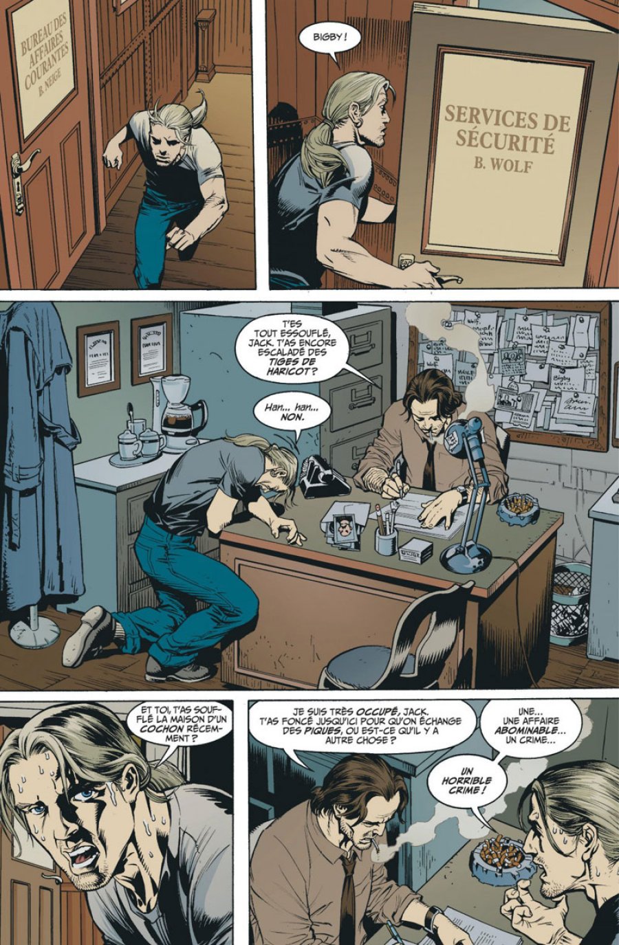 Imaginez. Imaginez que des cochons qui parlent vous croisent dans la rue. Imaginez que la Belle et la Bête discutent de contrats de mariage auprès de l'adjointe au maire. Imaginez que le Grand Méchant Loup se soit installé comme détective, ayant désormais pignon sur rue. Voici le monde des Fables, tel que nous le connaissons depuis que le Dernier Château est tombé devant les armées conquérantes de l'Adversaire. Un monde où les héros des contes de notre enfance se sont réfugiés, dans un voisinage clame mais tendu, entre les murs de Fableville. Ils vivent heureux. Jusqu'à la mort de Rose Rouge. La sour de cette dernière, Blanche Neige, ne trouve la force de surmonter son chagrin que pour confier à Bigby, le loup détective, la charge d'élucider cet assassinat. Et à Fableville, les suspects sont nombreux : est-ce Barbe-Bleue, avec qui Rose Rouge s'est publiquement affichée depuis quelques temps ? Est-ce le Prince Charmant, l'impécunieux gigolo ? Est-ce encore le Roi Cole, prêt à tout pour maintenir l'ordre dans Fableville ? Ou bien l'innocent et moqueur Gobe-Mouche ? Décidément, la vie n'est pas un conte de fée.
