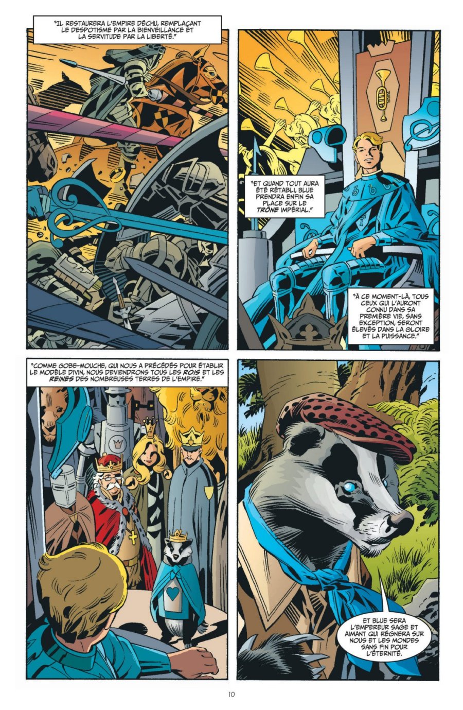 Si vous voulez faire un tour dans votre passé, retrouver tous les personnages de contes qui ont bercé votre enfance. Si vous voulez les retrouver à notre époque et totalement intégrés dans notre société. Si vous voulez savoir comment ils peuvent vivre parmi nous sans que l'on s'en rende compte. Si vous voulez savoir ce que le temps a bien pu changer en eux. Si vous voulez savoir quels sont les rapports qu'ils entretiennent entre eux aujourd'hui. Si vous aimez les contes revisités de façon tout à fait originale et étonnante. Si vous aimez le suspense, la magie, la vengeance, la traîtrise, les manipulations, les intrigues, les histoires d'amour torturées, les infidélités, les scénarios intelligents, les meurtres, le voyage, le cinéma, l'amitié, la justice, le châtiment, la peine de mort, le secret sous toutes ses formes, la solidarité… Si vous ne savez pas quoi lire ce soir. Si vous allez entreprendre un voyage, le format de cette série est idéal pour les transports. Pour toutes ces raisons et bien d'autres, Fables est incontournable. Si vous ne deviez lire qu'un conte et un seul, ce serait Fables, indéniablement le conte le plus riche de tous les temps. Tomes 9 à 12 Même qualité que les tomes précédents, toujours autant d'inventivité et un suspense à se damner. Tomes 13 : 0/5 Waouh ! Je bloque, terriblement néfaste pour ma santé mentale ce tome, une morale à deux balles tout du long, les gentils c'est bien, les méchants c'est pas bien et évidemment les gentils gagnent toujours par la grâce de Dieu et du bon vouloir des auteurs. Bref, je n'arrive plus à avancer, j'ai arrêté d'acheter la série, sans parler du changement d'édition, encore. Retomber dans une guimauve pareille me bloque littéralement. Je passe ma note de 5/5 à 3/5 sans option d'achats, peut-être qu'un jour j'arriverai à lire la suite mais en attendant ce tome 13 a été fatal à la série.