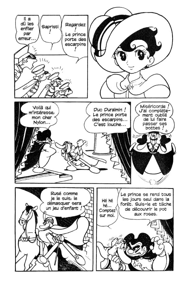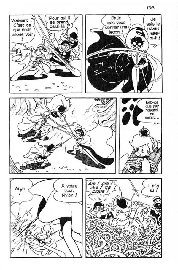 Je ne m'attendais pas à grand chose avec cette série : je commence à bien connaître le style Tezuka et ses quelques particularités ne m'ont guère surpris dans cette série là. J'ai toujours du mal avec le dessin de Tezuka d'autant plus qu'il est ici très enfantin. Certains personnages sont d'ailleurs dessinés à la façon cartoon, tant et si bien que le seigneur Nylon, par exemple, me rappelle carrément Fone Bone avec la tête qu'on lui a faite. Mais ici le scénario s'adresse résolument à des enfants à mes yeux. Hormis le coup du petit ange qui doit faire en sorte que Saphir redevienne une fille à part entière, tout le reste de l'histoire est franchement déjà vu pour moi. La princesse qui tombe amoureuse du prince du pays voisin mais qui ne peut lui avouer qui elle est réellement, la princesse qui se retrouve emprisonnée par le méchant rival de son père qui veut prendre le pouvoir, la princesse qui joue les justicières masquées ensuite pour défendre la veuve et l'orphelin... La narration est traitée sur un ton léger et naïf, ne se prenant pas au sérieux mais ne suffisant pas du tout à me captiver. En lisant le tome 1 de cette série, j'ai eu l'impression de relire une histoire dont je connaissais déjà tous les évènements, sans jamais ressentir particulièrement l'envie de connaître la suite et de savoir ce qui allait arriver à la pauvre Saphir. Même l'humour de Tezuka (parfois décalé comme dans Phenix) n'a pas suffi à me dérider et à trouver l'histoire autre chose que bof sans plus.