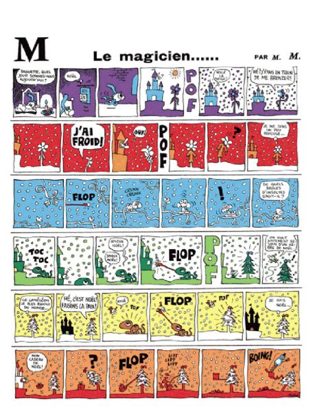 Une série qui débute dans « Vaillant le journal de Pif », n° 1227 du 8 Décembre 1968 et se termine dans « Pif Gadget » n°245 du 7 Novembre 1973. Pas mal. L’auteur fait évoluer son personnage dans un monde féerique, hors normes classiques pour l’époque. C’est vrai, c’est assez minimaliste : intervenants « simples », décors à peine « dégrossis »… m’ont rendu un peu perplexe en première lecture. Mais je suis entré dans ce petit univers et ai apprécié les tours de ce magicien. Car, l’air de rien, il ne s’agit pas d’une série « nunuche ». Bien que les historiettes soient nimbées d’une certaine poésie, l’humour est très présent et, plus d’une foi, je me suis pris à me marrer tellement c’est bien tourné. Déconcertant, oui si l’on ne fait que « passer ». Attachant surtout si on s’y arrête un peu, une série qui n’a pas plu au lectorat. Pourquoi ?… aucune idée réelle. Hors classicisme, hors habitude du lectorat de l’époque ?… peut-être. « M » est parti voici quasi 35 ans. Personne ne le regrette (à vrai dire, moi non plus d’ailleurs)… et c’est peut-être un peu dommage…