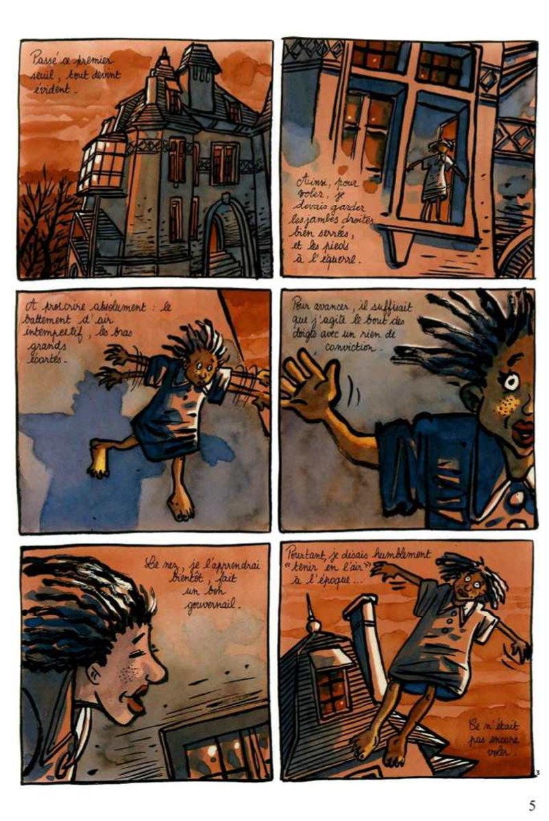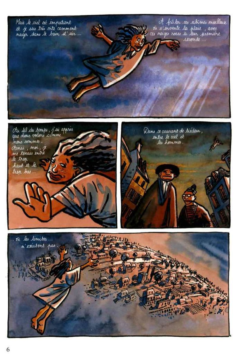 Le postulat ?... c'est l'histoire d'une petite fille qui, un jour, se met à voler... tout comme l'oiseau. Simple et joli... Mais elle est poursuivie par un père boucher qui n'en veut qu'à son sang et à celui de sa petite soeur. Là, ça se complique !... Le duo Tronchet-Sibran (au scénario) m'avait déjà "donné" un magnifique Là-bas ; un très bel album qui traitait de la délicate question des Français d'Algérie et de leur retour problématique en métropole. Le duo s'est ici reformé pour concocter et m'offrir, à moi lecteur, un récit poétique, onirique, aigre, et aussi inquiétant. Un récit de 64 pages qui sent la haine, le dégoût... la merde même. Le dessin -faussement naïf- de Tronchet est très bien exploité. MAIS, bon, fallait-il vraiment 64 pages pour cette histoire ?... Bon album quand même...
