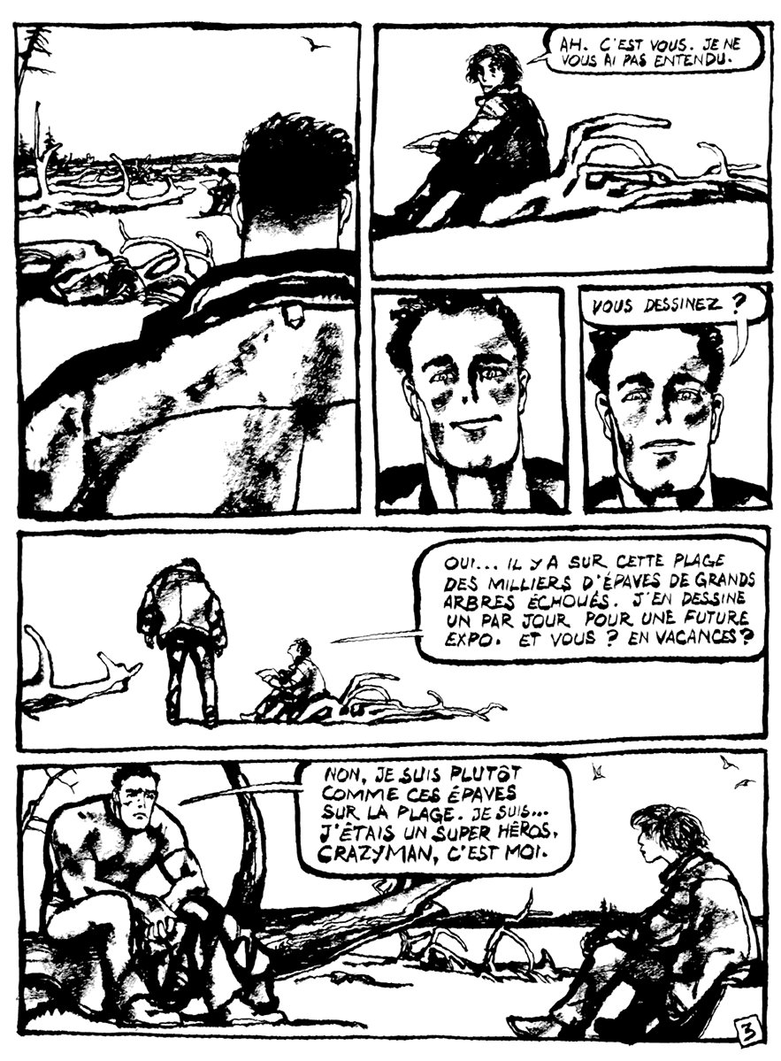 Dès le départ, Baudoin nous montre un super-héros blasé (vaguement inspiré de Superman), peu sûr de lui et se posant des questions existentielles. L’angle d’attaque est intéressant. La suite l’est tout autant. Il est amusant de voir comment Baudoin démystifie le super héros, lui rendant sa part d’humain. Crazyman a d’ailleurs du mal à quitter ses habits de héros. Les divers épisodes se laissent lire agréablement (j’ai juste trouvé trop long celui se déroulant au Japon). Et j’aime vraiment beaucoup son dessin, très reconnaissable, avec un Noir et Blanc utilisant un trait gras, mêlant réalisme et onirisme, finesse de certains détails et flous pour d’autres aspects. Voilà un petit album original, dont je vous recommande la lecture. Note réelle 3,5/5.