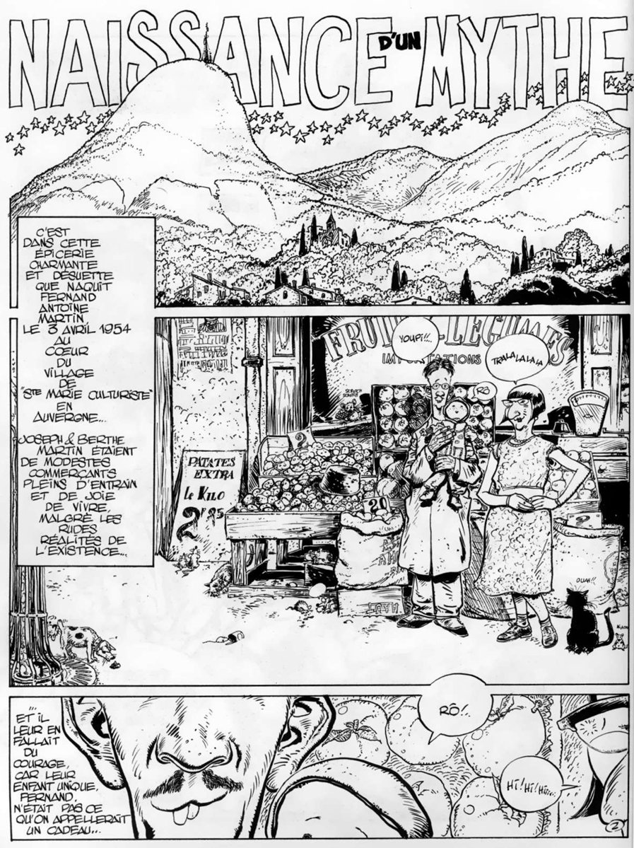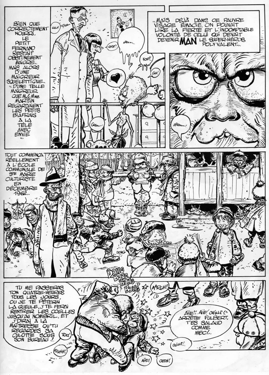 Fernand Antoine Martin est né le 3 avril 1954 ! 9 ans jour pour jour avant moi ! Bien que correctement nourri, le petit Fernand reste obstinément maigre mais alors d’une maigreur squelettique. Un petit biafrais ! Mais déjà dans ce pauvre visage émacié, on pouvait lire la fierté et l’indomptable volonté de celui qui devait devenir MAN, le super héros polyvalent ! Alors oui cela ne vole pas très haut. Nous sommes même plutôt au niveau des pâquerettes avec ce super héros en quête de justice. Sur les plages ou dans les magasins, il défend la veuve et l’orphelin. Il ne fait pas dans la finesse le garçon. Il cogne. Il joue des poings. Et il s’en va, satisfait de sa prestation. C’est un brin stupide je l’avoue, mais j’ai ri à certains de ces gags potaches. Même si certaines blagues sont répétitives, sur un seul album cela le fait. Le graphisme est bien dans la lignée de l’écho des savanes. Un dessin absurde rebondit sur le précédent faussement sérieux. C’est bon ça non ? Un pastiche sympathique à découvrir. Un « SuperDupond » revu et corrigé.