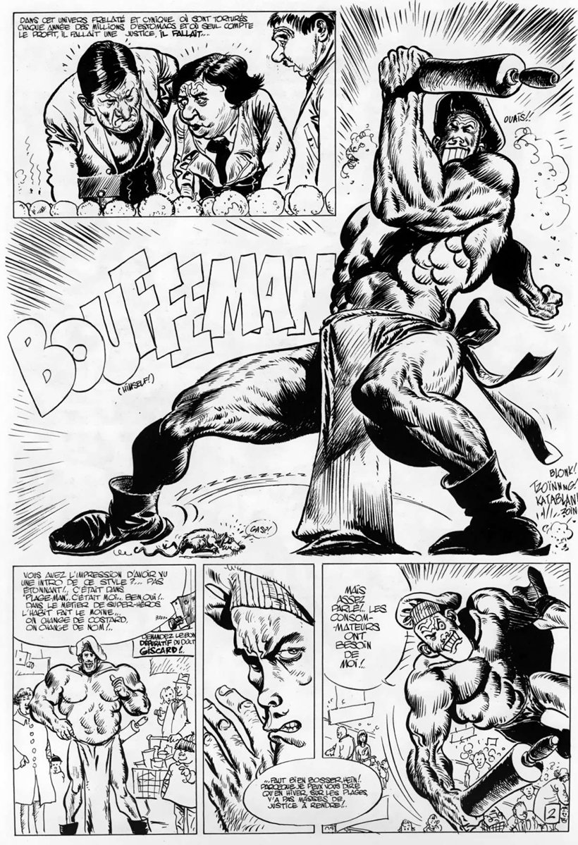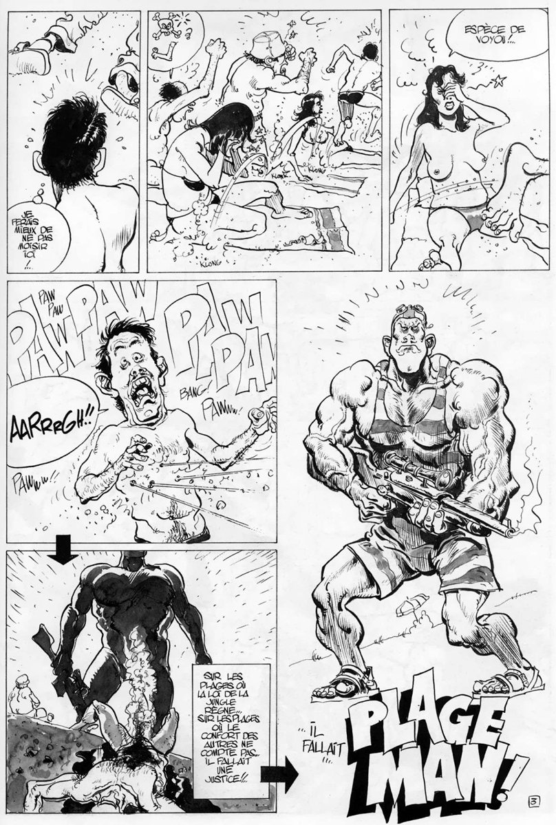 Je ne suis pas du tout fan ou lecteur de comics de super-héros de chez Marvel ou DC Comics, mais suis prêt à faire preuve de curiosité dès qu’il s’agit de ne plus se prendre au sérieux, lorsque la parodie pointe (voir par exemple, dans une version plus érotique, Sticky Pants (ça colle et ça moule les bollocks)). Aussi ai-je acheté cet album – pas cher il est vrai – après un rapide feuilletage (je ne le connaissais pas). Après avoir été ridiculisé, bafoué, toute sa jeunesse, un pauvre type, une fois devenu adulte, se transforme en justicier, en super-héros. C’était une vocation il est vrai. Oui, mais quel super-héros alors ? Et donc ce justicier moderne endosse tour à tour le rôle et la tunique de Plageman (aussi débile, mais plus bodybuildé et agité de la gâchette que celui de Bouzard – qui n’a donc pas inventé ce super héros de bac à sable !), Bouffeman (qui défend le client de supermarchés avec des méthodes plus expéditives que 50 Millions de consommateurs !), Bédéman (qui se cherche une identité par encore déposée par un auteur, jusqu’à devenir Man – tout simplement – super-héros « polyvalent »), Pafman (justicier de l’audiovisuel – les Patrick Sabatier, Jacques Martin, Jean-Pierre Foucaud et autres animateurs débiles, et plus généralement la télé commerciale, sont passées à la moulinette, au nom de la défense de l’intelligence et de la culture), etc. Vous l’avez compris, nous sommes là dans la caricature, l’humour gras (et un peu noir), genre qui m’intéresse a priori. Mais si certains gags sont amusants (et le dessin de Coutelis est plutôt bon, expressif et globalement efficace), ce n’est pas toujours assez caustique, drôle à mon goût. Le super-héros crie, casse tout, mais c’est un peu répétitif. Certains auteurs de chez Fluide Glacial (Gotlib, Maester, Lob, Alexis), avec des personnages comme Super-Dupont ou des délires de Rubrique-à-Brac ont mieux réussi que Setbon dans cet humour parodique. Reste que l’album – pas forcément très courant dans les bacs il est vrai – peut intéresser les amateurs du genre (à vous de voir pour l'achat).