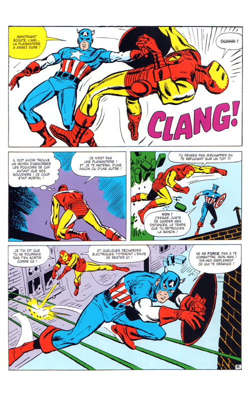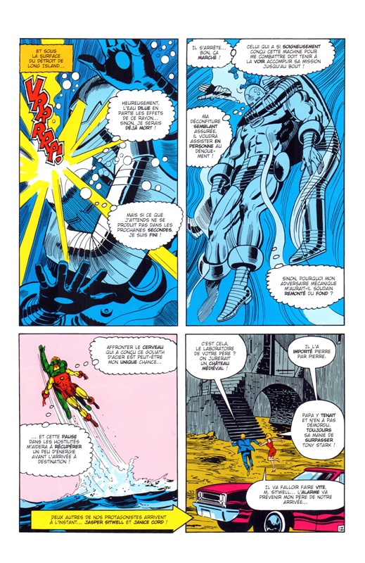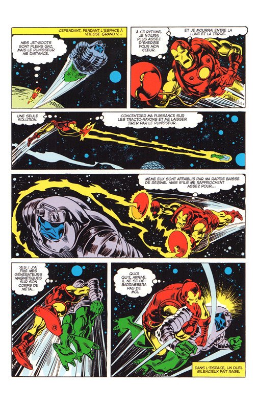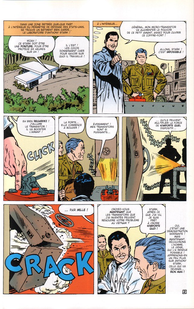 Tiens !?... Un super héros américain qui vient me raconter son histoire !... Iron Man, puisque c'est lui, fait sa première apparition dans "Tales of Suspense" n° 39 de Mars 1963. Stan Lee est au texte, Don Heck au dessin. Après la première histoire, Lee va confier la suite des scénarios à Larry Lieber. Au cours des épisodes qui suivent, car plébiscité par le lectorat américain, Iron Man va connaître divers autres auteurs : Archie Goodwin et David Michelinie en tant que scénaristes ; John Romita, Gene Colan, Bob Layton, etc... en seront des graphistes. Dès 1968, notre justicier possèdera son propre "comic book" publié chez Marvel. Il fera l'objet de dizaines de traductions françaises dans autant de parutions brochées éditées en France. Occasionnellement, Iron Man interviendra au sein de divers groupes de super héros (The Avengers, The West Coast Avengers, The S.H.I.E.L.D.) pour des aventures communes. Iron Man possède à ce jour des dizaines de publications à son nom. L'album : j'ai préféré -ici- aviser l'album de sa genèse, édité chez Artima-LUG en 1980. Vous y apprendrez -entre autres- les débuts de son histoire. Rien ne vous empêche, bien sûr, de connaître la suite de ses aventures dans les multiples publications Marvel. "Iron Man" ?... Un héros pas trop connu de ce côté ci de l'Atlantique. Il est vrai qu'il ne possède pas de pouvoirs propres et ne bénéficie pas ainsi de l'aura que dégagent certains de ses autres "collègues" made in USA.