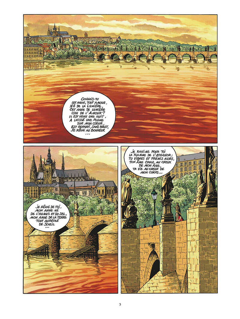 Je n'ai pu lire que les 2 premiers albums de cette série, ma médiathèque n'ayant pas le 3ème, mais de toute façon, je n'ai rien perdu. C'est un récit hyper compliqué, au propos nébuleux ou dont le sens m'échappe, en tout cas pas captivant du tout, avec des changements d'époques sans transition, et une vision du mythe du Golem complètement grotesque. L'ensemble s'imbrique par de faibles indices seulement. Pourtant, ces époques historiques visitées sont intéressantes, il y avait sûrement quelque chose à faire, mais Joëlle Savey n'a pas su jouer une carte plus simple ; finalement, elle est plus douée pour dessiner que pour scénariser. Sur le plan graphique, c'est beaucoup mieux, j'aime le dessin de Wachs depuis Marie Tempête, et ici, il réussit de beaux décors précis de Prague et d'Italie, mais je me demande s'il comprenait sur quoi il dessinait tant c'est nébuleux. Pour son dessin appliqué, je met 2/5, sinon le scénario ne vaut rien..