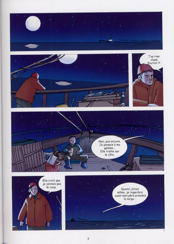 Voici un récit sur lequel flotte l’esprit des légendes bretonnes. La mer, la mort et le fantastique y pointent donc le bout de leur nez. Mais cet album est avant tout destiné aux enfants et doit être abordé comme tel. L’histoire est intéressante mais pas totalement maîtrisée. Il nous manque quelques explications… qu’un enfant ne cherchera sans doute pas. L’idée sous-jacente du récit est elle-même assez vague. Acceptation de la mort ou besoin de montrer aux enfants qu’un adulte est un enfant qui a grandi… je ne saurais dire. Et c’est là quelque peu décevant. Le dessin, s’il dévoile un certain potentiel grâce à la tendresse qui s’en dégage, m’est malheureusement apparu fort vide. Le grand format de l’album ne lui convient pas et accentue encore cette impression de « vide » dans des cases souvent trop grandes pour l’illustration qu’elles renferment. D’ailleurs, ce n’est pas un hasard si « Clara (Le Lombard) », autre album de la dessinatrice, avec un profil d’ailleurs assez semblable, fonctionne nettement mieux. Certes, l’auteure a progressé entre temps mais le format réduit de l’album n’est pas pour rien dans ce sentiment d’un dessin plus cocon (et pas plus con con, je vous vois venir), plus chaud, plus intime. Au final, Edlyn propose une histoire prioritairement destinée aux enfants, pas désagréable mais un peu vaine. Elle dévoile aussi le potentiel d’une dessinatrice sensible. Pas abouti mais pas à dénigrer non plus. Un emprunt me parait cependant plus indiqué qu’un achat.