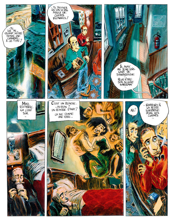 Une curiosité, d’abord prépubliée dans la revue (A suivre), qui intrigue dès la couverture. Albert est gérant d’un petit hôtel de la banlieue parisienne, du genre qui reçoit plutôt des habitués un peu fauchés, que des touristes. Albert, lui, est du genre doux rêveur, il se fait des films qui mettent en scène les occupants de l’hôtel... ou la belle inconnue de l’affiche d’en face. Cette propension à rêver sa vie rend le récit parfois assez difficile à suivre, d’autant que certains personnages ne sont peut-être pas ce qu’ils semblent être. Le scénario se compose de petites saynètes, tout d’abord apparemment sans lien avec l’hôtel, avant que ce dernier finisse par se dévoiler. Alors, il est parfois nécessaire d’opérer des retours en arrière, pour comprendre de quoi il retourne réellement. Cela dit, l’histoire -empreinte d’une certaine poésie et d’humanité- dégage un je-ne-sais-quoi qui la rend attachante, si bien que l’on fait volontiers cet effort de compréhension. Ajoutez à cela un traitement graphique original, sans contour, tout en couleur directe pour représenter ce qui se passe dans la réalité ; et avec un trait plus nerveux, différent, pour marquer les passages qui se situent dans l’imaginaire des personnages, ou bien ceux où Albert lit une BD. En outre, je trouve que Pourquié a une façon assez touchante de dessiner les vieux quartiers un peu délabrés et comme hors du temps parce qu’épargnés par la spéculation immobilière. Voilà, ce n’est pas un coup de coeur, mais une BD que j’ai lu avec intérêt et un certain plaisir, malgré la sinuosité du scénario.
