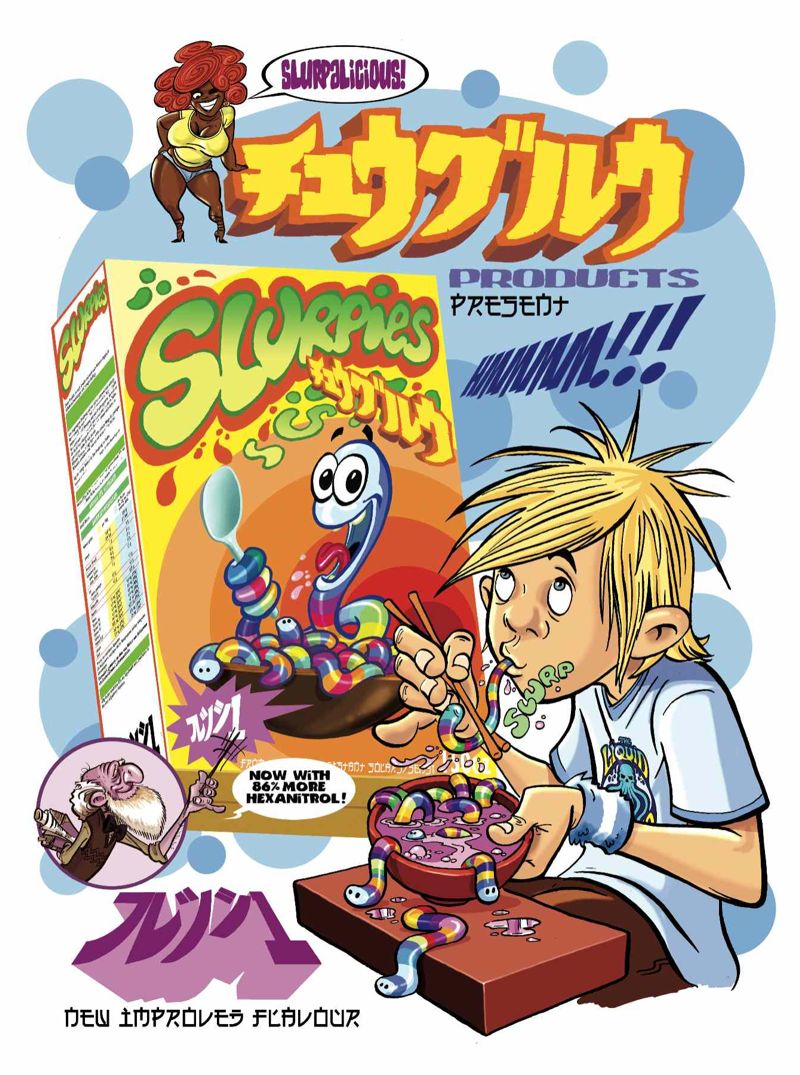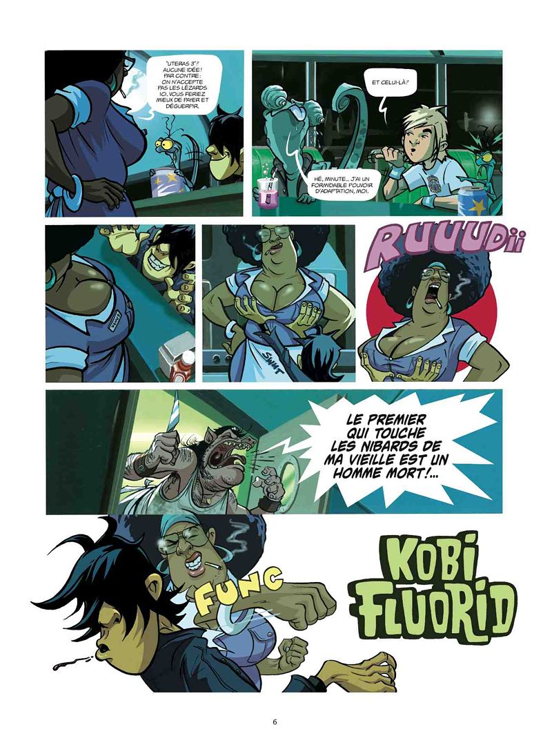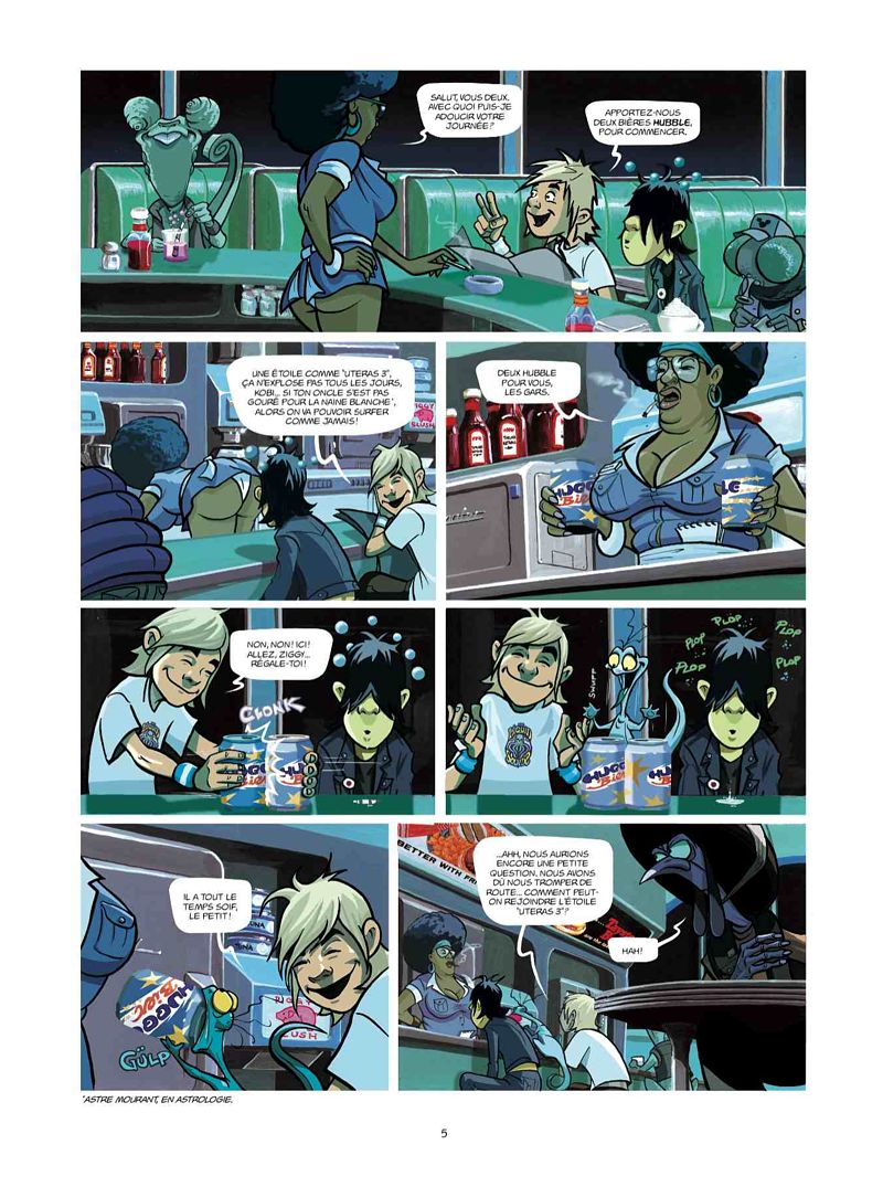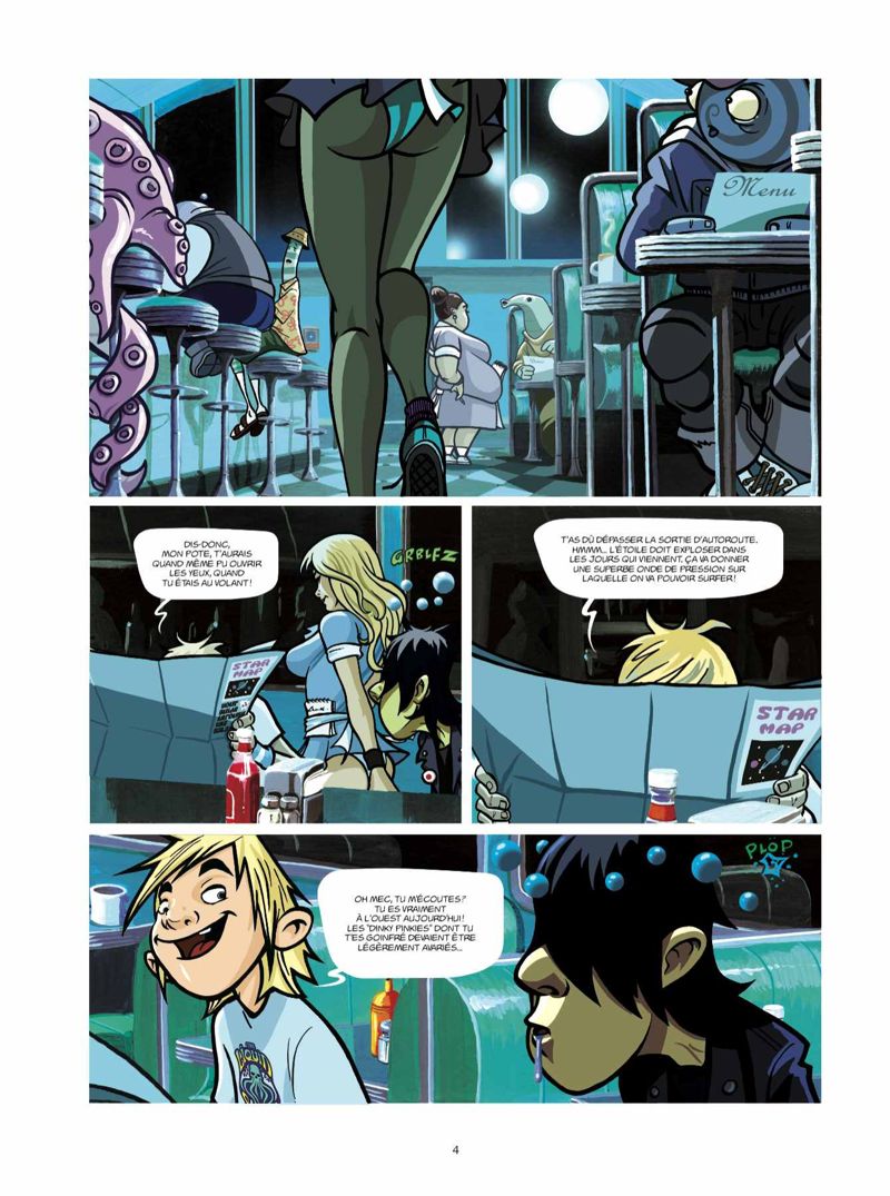 Le graphisme de cette BD détonne vraiment. Très inspiré des clips des Gorillaz, dont on retrouve d'ailleurs certains éléments visuels et narratifs au cours de la BD, il est maîtrisé, fun et très coloré. Ambiance 70s, couleurs flashy, persos cools... L'auteur fait une grande utilisation de l'informatique, des insertions d'images et d'une esthétique de designer de pub ou de pochette de disque. C'est réussi et assez amusant à regarder comme à lire. Par contre, je ne suis pas convaincu par le scénario. Il présente dans un décor space-opera le road trip de deux loosers un peu shootés qui voyagent dans leur van-spatial pourri pour surfer sur l'onde d'une nova. Ces deux derniers vont jouer le rôle de corniauds car deux escrocs vont leur faire passer la douane en douce avec un oeuf mystérieux. S'ensuit course-poursuite pour récupérer l'oeuf, naufrage sur une planète où les indigènes les prennent pour des dieux, etc. Pas très novateur et pas très passionnant. Et surtout, ce gros album que forme le tome 1 se termine finalement à la page 36 seulement, laissant ensuite la place à de nombreuses pages d'illustrations, sympas peut-être mais ce ne sont que des illustrations. 36 pages seulement, ça fait mal quand on croit payer une BD complète au prix tout à fait conséquent de 13€.