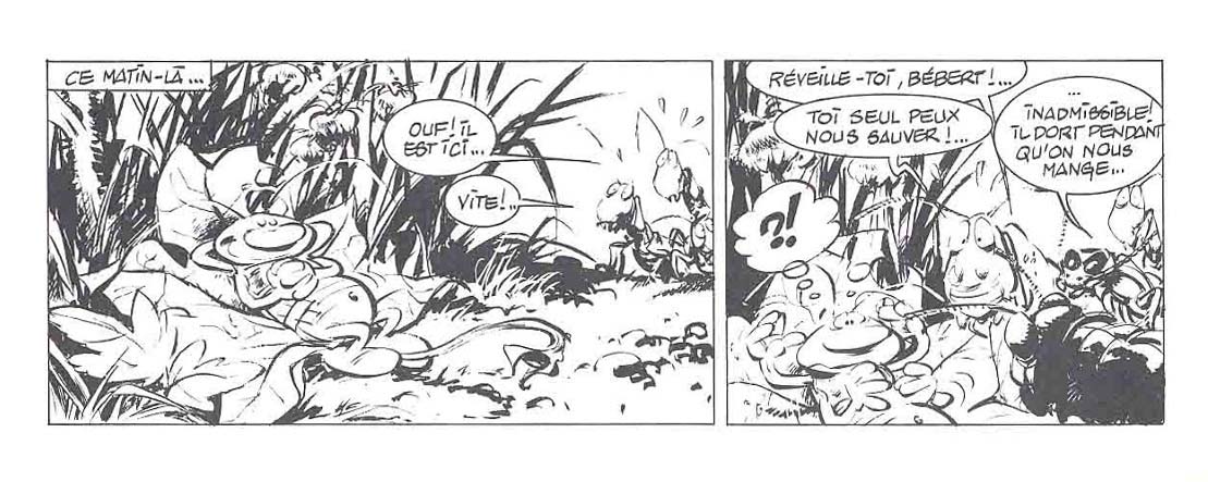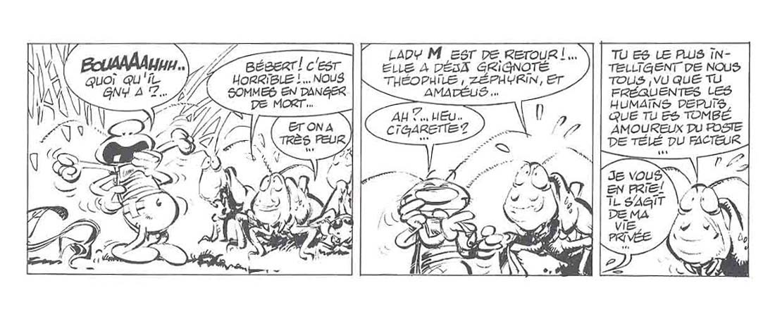 L'une des premières collaborations de Yann et Conrad, indispensables auteurs de la série Les Innommables dont le premier tome était paru un an avant. Bébert le Cancrelat tient plus du petit album gadget que de la BD complète. Son histoire est en effet très courte et l'album, avec son prix initial de 45F, était plutôt un objet de luxe en comparaison. Le dessin de Conrad y est très bien. Son trait m'y fait un peu penser à celui de Franquin. L'encrage est par contre étonnamment très léger, pas assez contrasté à mon goût. Est-ce que cela tient à un soucis d'impression à l'époque (j'ai lu la version de 1984, pas l'album à découper offert avec l'album Au sud-ouest de Moscou des Innommables paru en 2005) ? L'histoire quant à elle est sympathique, avec une bonne dose d'humour noir et un peu de politiquement incorrect. Elle est cependant un peu courte et un peu simplement résumée. A mon sens, même si elle est sympathique, cette petite BD ne vaut ni son prix à parution ni son exorbitant prix d'occasion de nos jours.