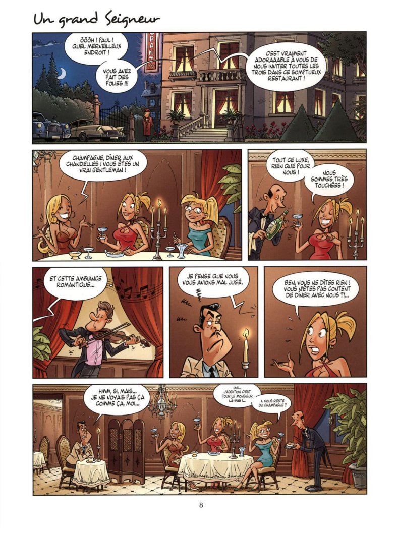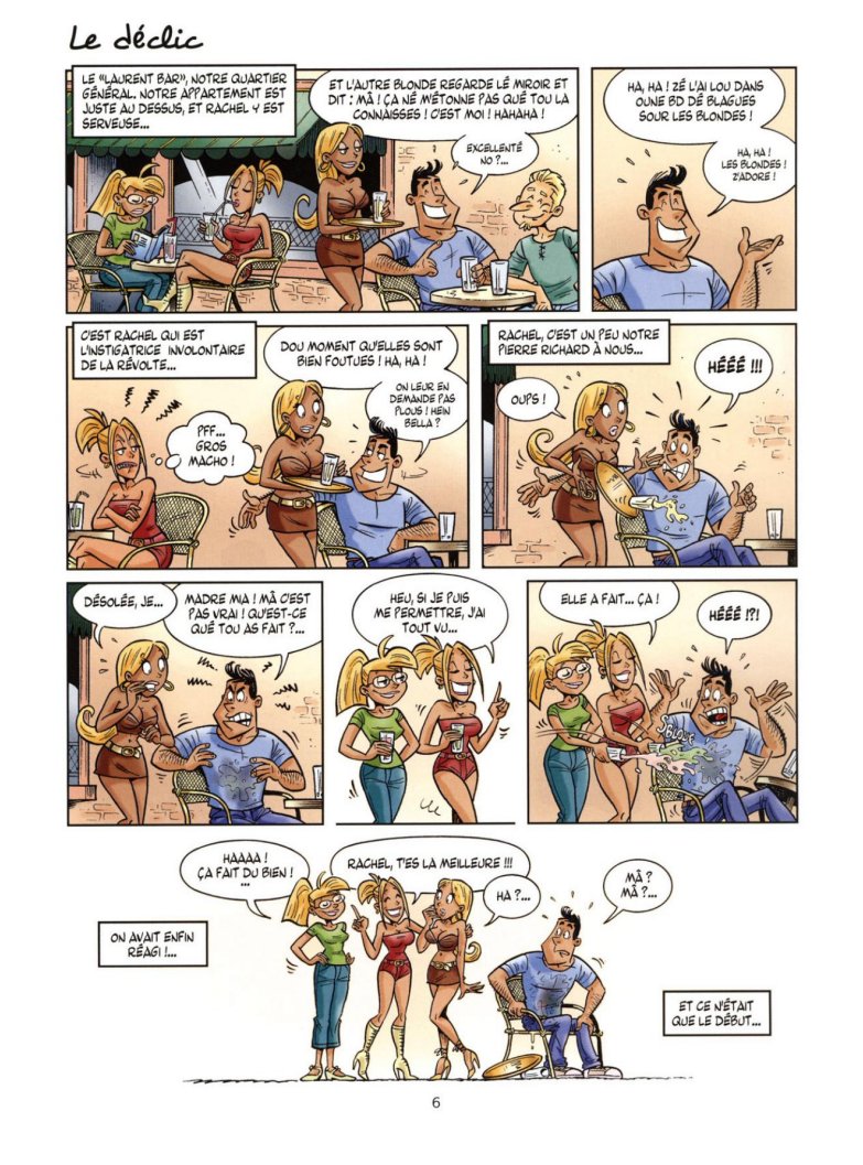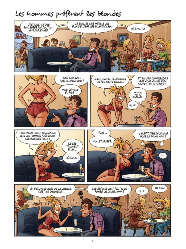 Évidemment il ne faut pas s'attendre à la bande dessinée de l'année quand la revanche des blondes vous tombe entre les mains. Je ne sais pas quelle est la part d'Eve Angeli dans les scenarii des gags, je pense qu'elle se contente de prêter son image et d'en faire la promotion à la télévision contre compensation financière. Tout le monde est gagnant, l'éditeur lui va augmenter ses ventes. Côté histoires, cela a la mérite d'être un peu original. Pour une fois ce sont les blondes qui ont le beau rôle et se vengent des machos et des brunes. De la bédé pop-corn.