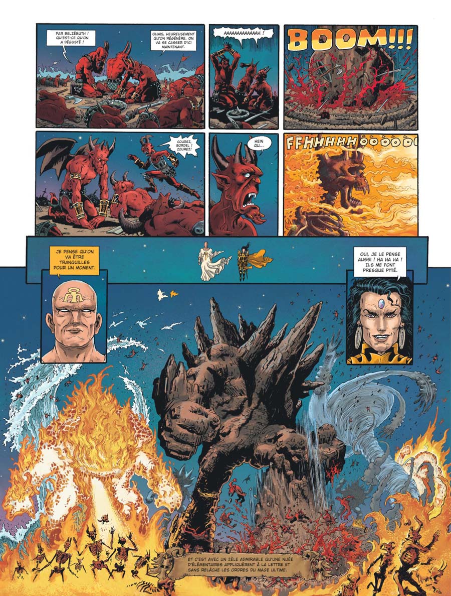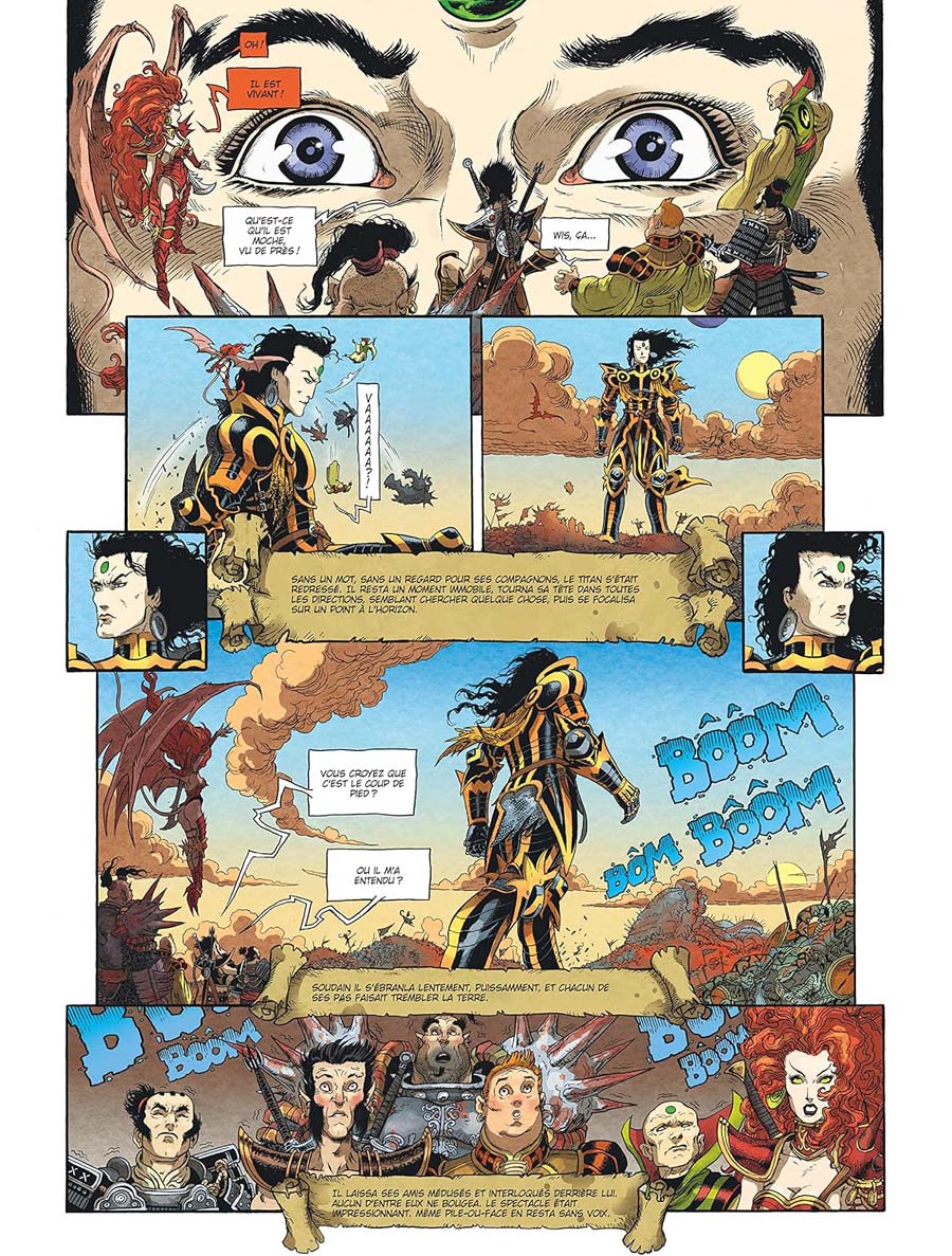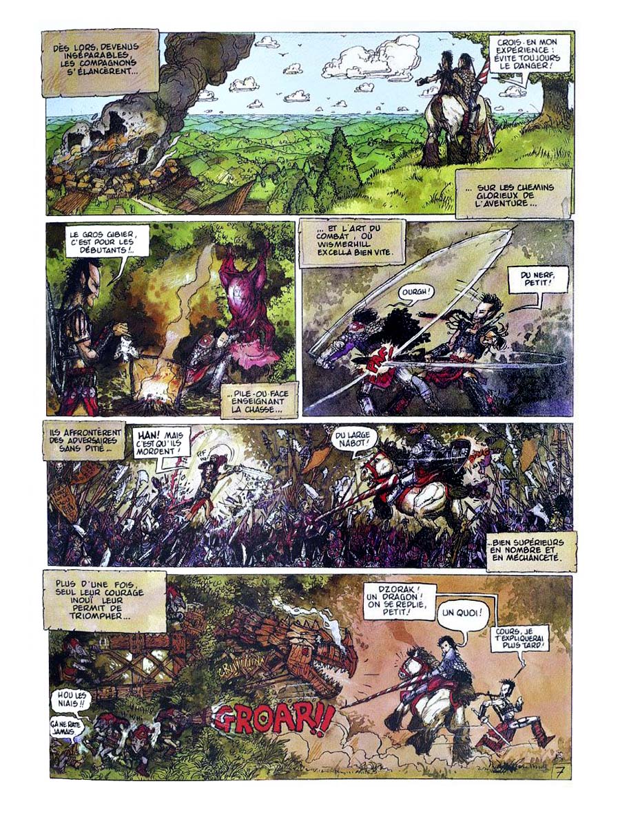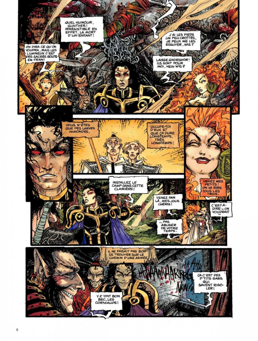 Chaque album est lu relativement vite, car il y a beaucoup de pleines pages sans texte, et finalement peu de dialogues – voire même d’intrigue d’ailleurs ! C’est un peu là que cela pêche d’ailleurs. En effet, j’ai eu souvent l’impression que l’histoire évoluait au hasard, sans construction solide pour l’étayer. Du coup, cela donne une impression d’empilage d’idées (plus ou moins originales et/ou empruntées à d’autres – Le seigneur des anneaux par exemple). De fait, c’est avant tout une succession de bastons, de pif boum paf, la petite bande de héros tabassant des hordes d’adversaires (très nombreux – d’ailleurs c’est parfois saoulant tous ces personnages, on a du mal à suivre). Quant à la psychologie des personnages, eh bien on repassera. Comme pour les personnages, foisonnants et partant dans tous les sens, le décor joue sur le grandiose, le baroque, un peu comme les décors des films de Jackson adaptant Le seigneur des anneaux, avec aussi des découpages parfois proches de ceux de Druillet (mais sans la charge poétique, sa violence pure). Quelques touches d’érotisme (des nanas peu vêtues dessinées façon 666 (Froideval y est aussi au scénario), des couleurs pétantes, un décor jouant sur le gigantesque, voilà des artifices qui ne m’ont pas fait oublier le côté creux de l’histoire, que j’ai abandonnée au 6ème tome (j'ai voulu aller jusque là pour voir ce que le changement de dessinateur apportait). A partir du tome 6, Pontet prend donc le relais de Ledroit au dessin : ses personnages sont un chouia plus joufflus, mais cela reste dans la lignée de Ledroit. Plutôt bien fait, mais les cases trop surchargées renforcent le côté fouillis de l’histoire. Une série décevante me concernant.