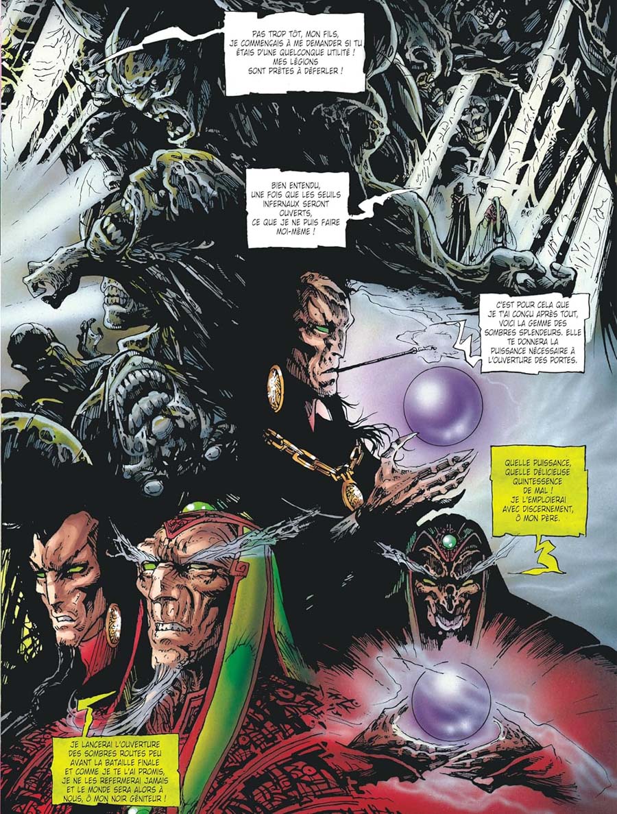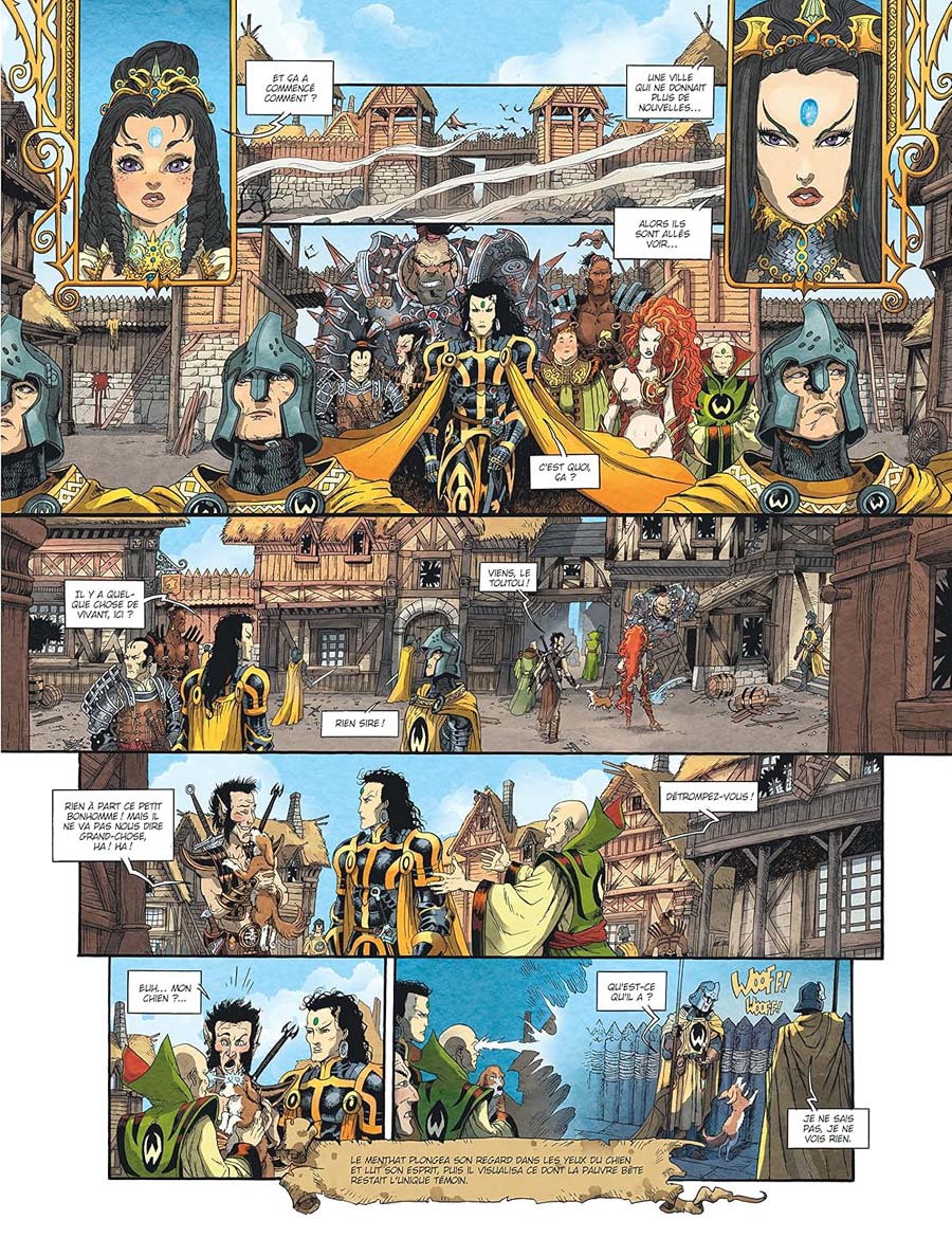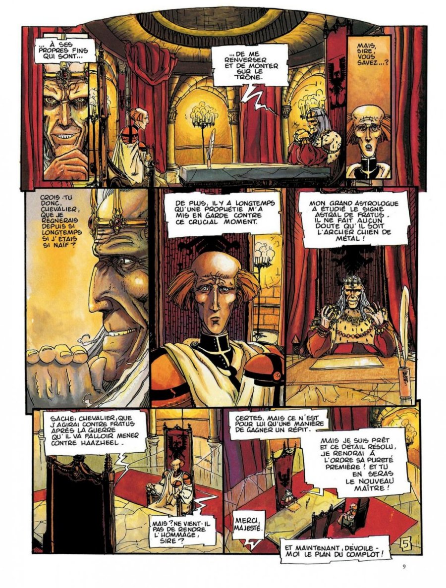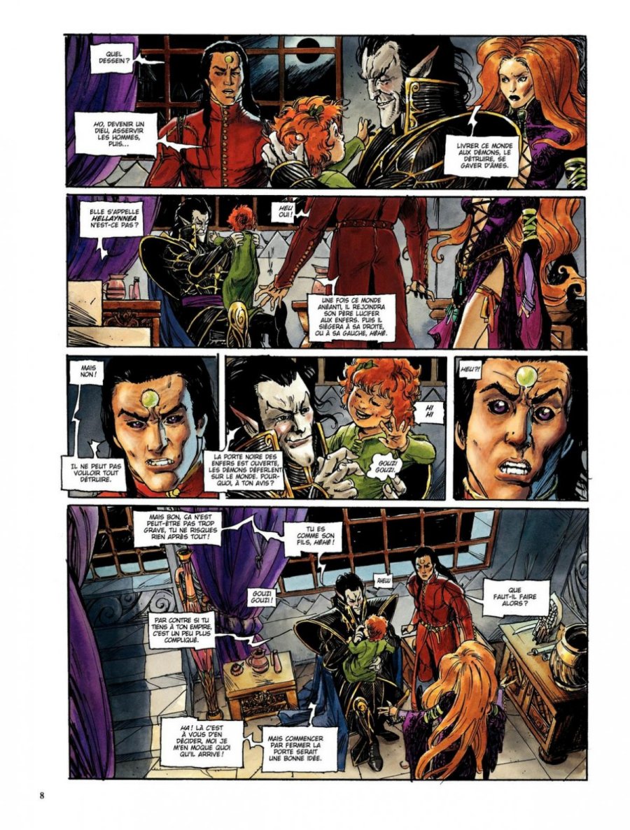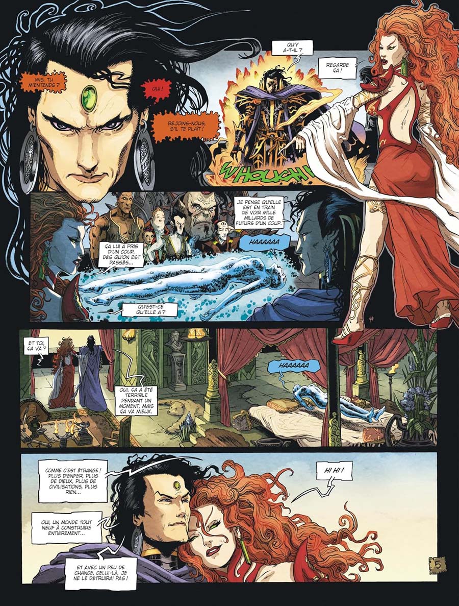 Chaque album est lu relativement vite, car il y a beaucoup de pleines pages sans texte, et finalement peu de dialogues – voire même d’intrigue d’ailleurs ! C’est un peu là que cela pêche d’ailleurs. En effet, j’ai eu souvent l’impression que l’histoire évoluait au hasard, sans construction solide pour l’étayer. Du coup, cela donne une impression d’empilage d’idées (plus ou moins originales et/ou empruntées à d’autres – Le seigneur des anneaux par exemple). De fait, c’est avant tout une succession de bastons, de pif boum paf, la petite bande de héros tabassant des hordes d’adversaires (très nombreux – d’ailleurs c’est parfois saoulant tous ces personnages, on a du mal à suivre). Quant à la psychologie des personnages, eh bien on repassera. Comme pour les personnages, foisonnants et partant dans tous les sens, le décor joue sur le grandiose, le baroque, un peu comme les décors des films de Jackson adaptant Le seigneur des anneaux, avec aussi des découpages parfois proches de ceux de Druillet (mais sans la charge poétique, sa violence pure). Quelques touches d’érotisme (des nanas peu vêtues dessinées façon 666 (Froideval y est aussi au scénario), des couleurs pétantes, un décor jouant sur le gigantesque, voilà des artifices qui ne m’ont pas fait oublier le côté creux de l’histoire, que j’ai abandonnée au 6ème tome (j'ai voulu aller jusque là pour voir ce que le changement de dessinateur apportait). A partir du tome 6, Pontet prend donc le relais de Ledroit au dessin : ses personnages sont un chouia plus joufflus, mais cela reste dans la lignée de Ledroit. Plutôt bien fait, mais les cases trop surchargées renforcent le côté fouillis de l’histoire. Une série décevante me concernant.