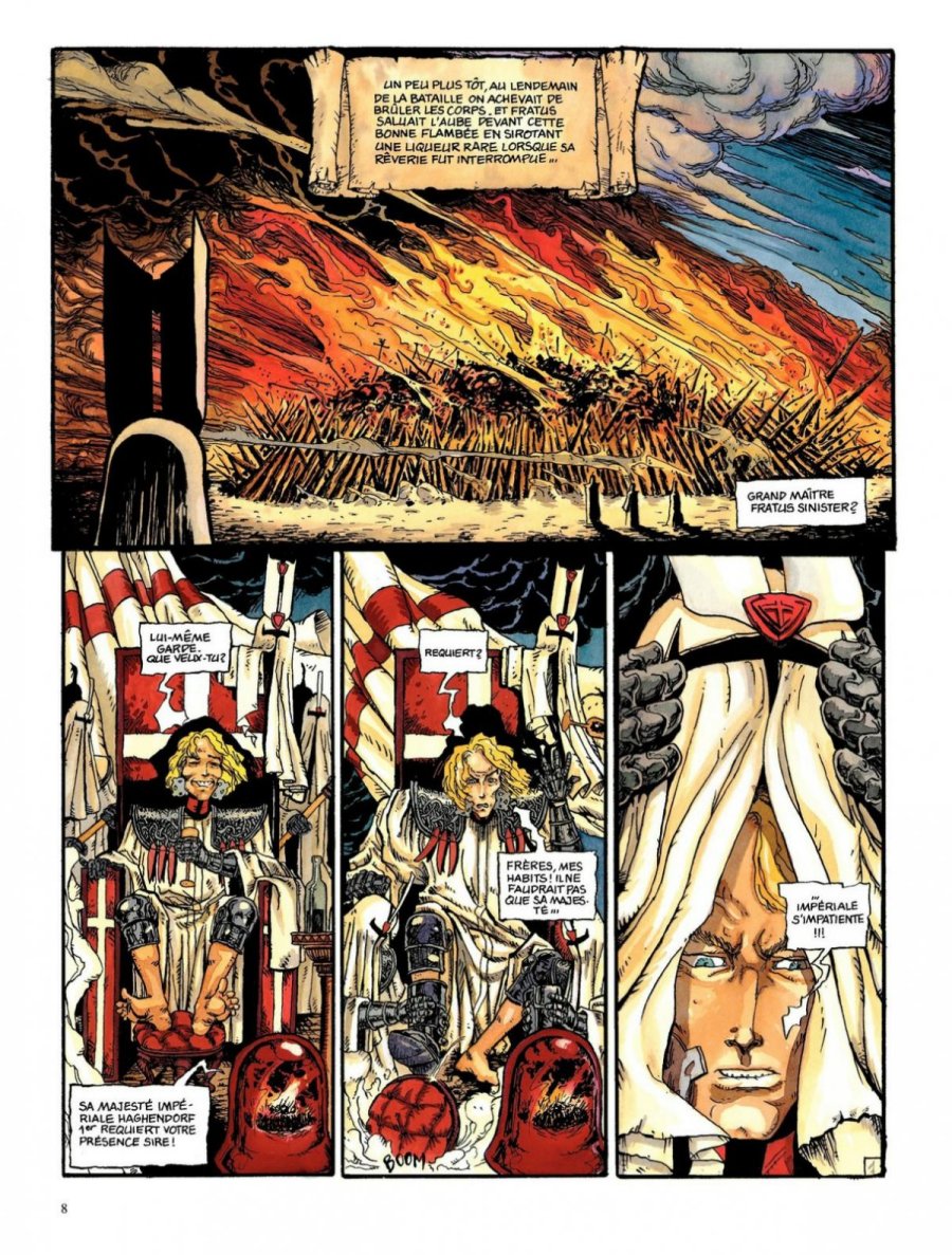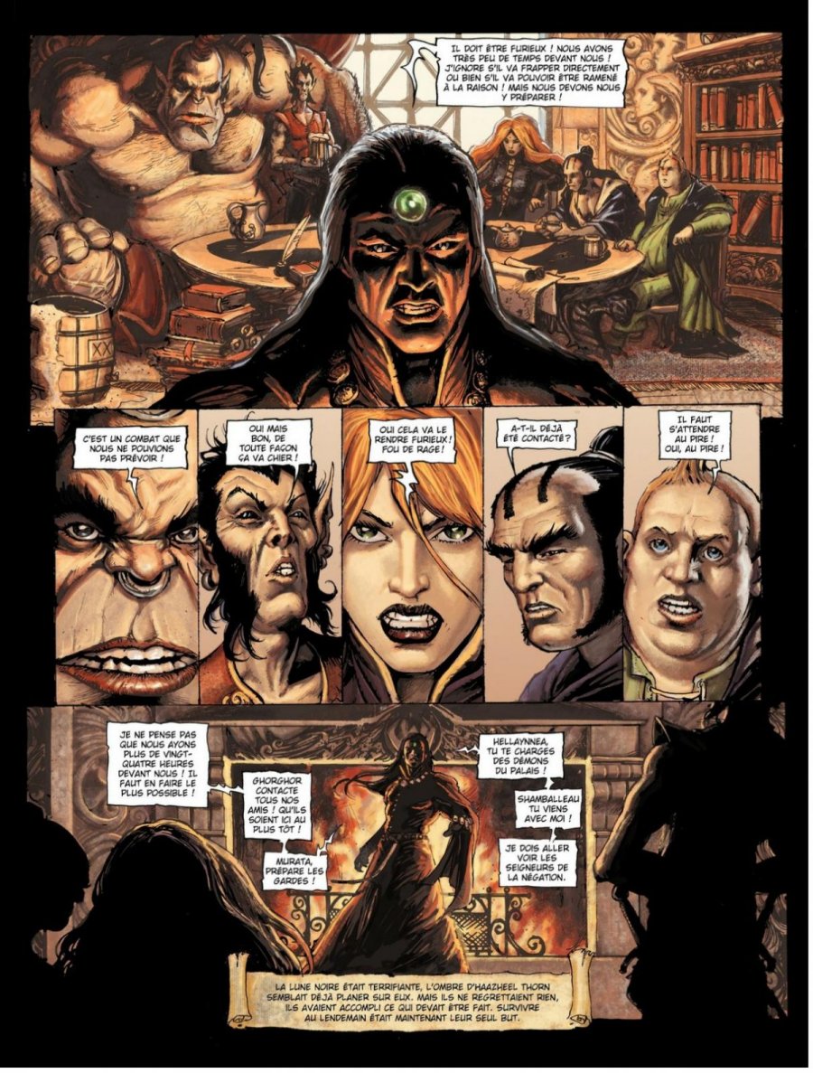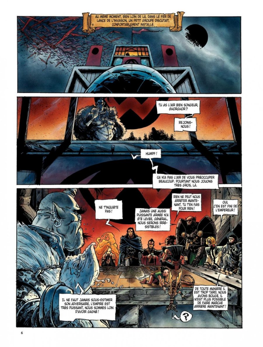 Scénario inexistant, grosses bastons entre armées, bourrinage à souhait. Le plus gros problème des chroniques de la lune noire est l'exagération grandissante, et le phénomène de "grobillisme" (= je "monte de niveau, et j'obtiens de nouvelles compétences/armes pour tout bourriner") y est omniprésent. Des armées de plus en plus importantes, et au final un scénario qui se réduit proportionnellement. Quant aux dessins, ils vont du passable au franchement horrible (surtout après Ledroit), une mise en couleur psychédélique... Bref, du grand n'importe quoi. Je ne conserve mes premiers tomes que pour m'amuser de l'évolution du dessin de Ledroit entre cette BD et Requiem. Lisez un ou deux tomes si vous êtes curieux, ça vous donnera une idée. J'ai mis 2 étoiles car certaines pages sont pas mal mais ça serait plutôt un 1.75/5.