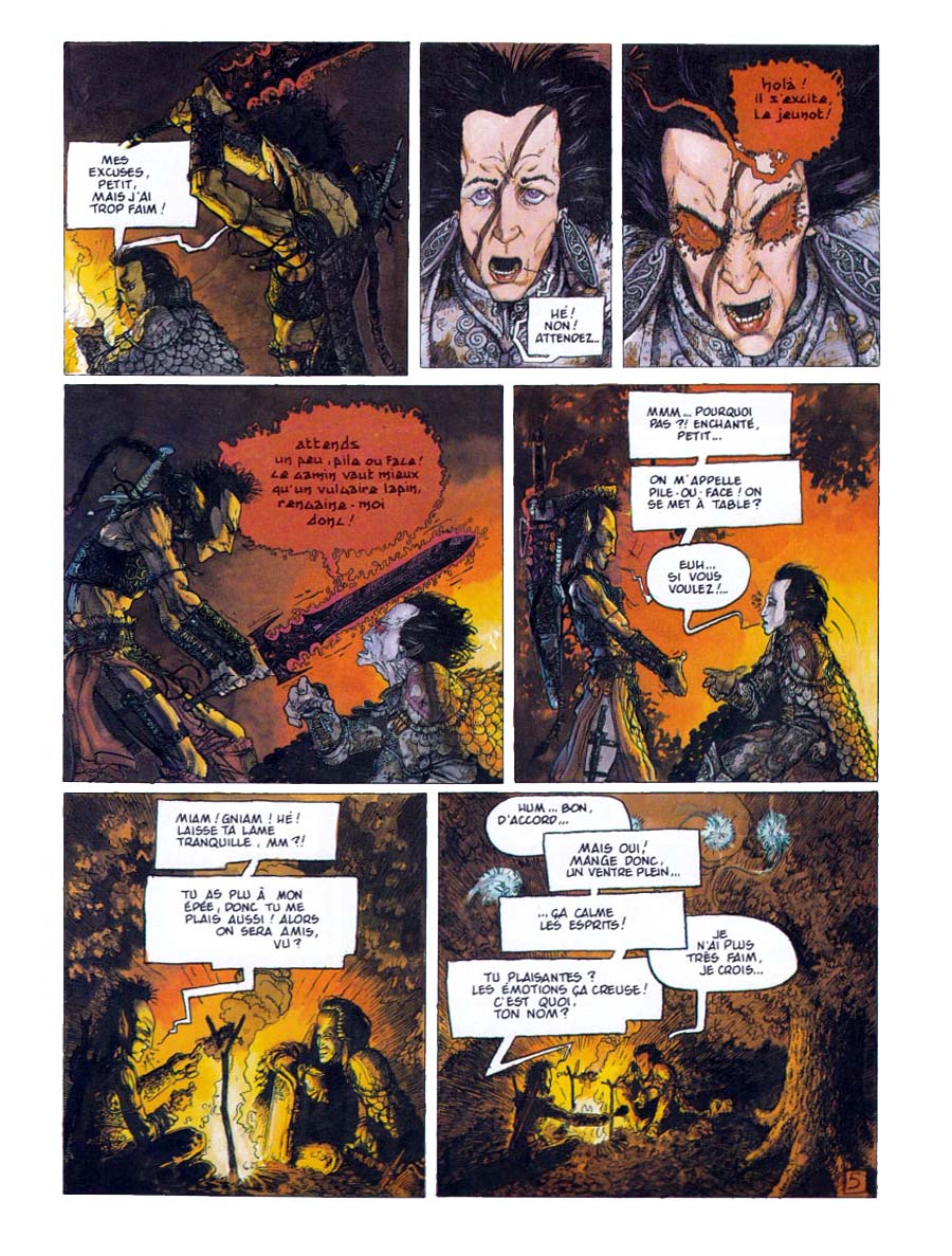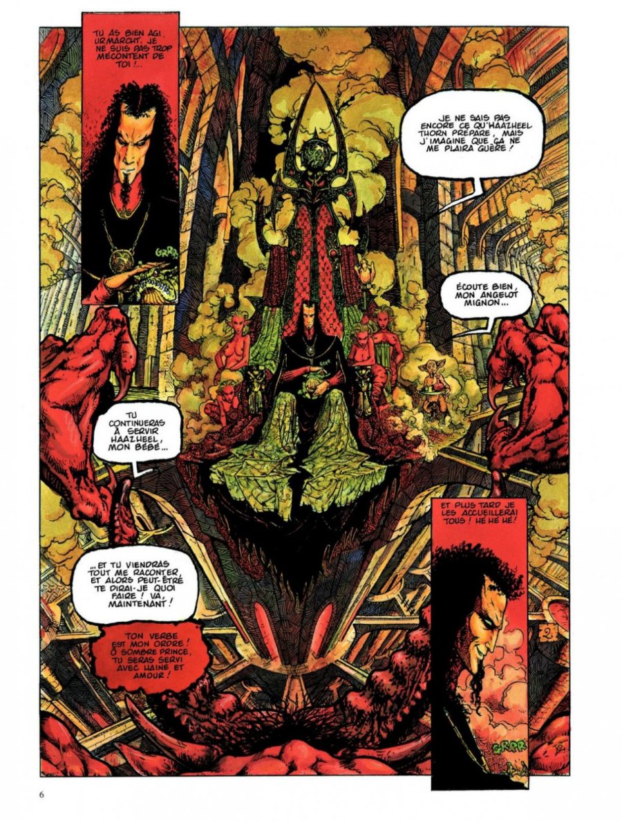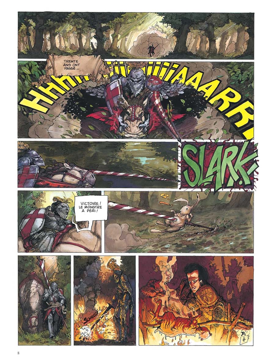 Dans la série j'ai une foultitude d'idées, je les mets dans une grande marmite et je fais lentement chauffer à feux moyens puis quand ça commence à faire des toutes petites bulles je sors le tout et avec mon crayon je note ce qui arrive au fur et à mesure. Quel bazar! J'ai vraiment eu l'impression que ça partait un peu dans tous les sens. Pourtant le début, bien qu'on y sente quelques hésitations tant au niveau du scénario que du dessin, laissait à penser que l'on se dirigeait vers une saga d'héroic fantasy un peu à la mode de Jack Vance. Outre les créatures bizarres, les nains, les puissances démoniaques, ces chevaliers de la lumière, etc, dont l'inspiration n'est pas très mystérieuse, se rajoutais ce petit côté picaresque plutôt bienvenu. Autant le dire j'étais sous le charme. Une série pas trop niaise qui puisait ses sources auprès de références qui personnellement ma faisait bien plaisir. On était pas dans la pâle copie. Bref, il y avait de l'idée. Dés le tome 2 j'ai commencé à déchanter. Je me suis dit ou va t’ont? Moi même pas peur je me suis dit que les auteurs menaient tranquillement leur barque et que nous allions gentiment retomber sur nos pieds. Alors eux sans doute mais moi c'est pas sur mes pieds que je suis retombé! Paisiblement, sans faire de bruit, une sorte de quête se met en place, un samouraï arrive, il faut trouver un oracle, pendant ce temps, dans l'ombre des vilains complotent, des armées sont en mouvements. Dire que ça devient touffu serait un euphémisme. Et puis voilà donc le dessin. Je sais bien que je m'attaque à ce que d'aucun qualifierait de monument. Bon tout a été dit, pour ma part disons que tout cela est effectivement très virtuose, il y a des choses très jolies mais l'ensemble ne me fait pas sauter en l'air. Par ailleurs grand amateur d'héroic fantasy j'ai l'impression qu'ici je ne suis pas dans la cible tant les choses sont d'un simplisme qui me navre un brin. Inutile de vous dire que je ne suis pas allé au bout des, quoi 17 tomes? j’espère qu'après tout ce temps les amateurs y trouvent leur compte!