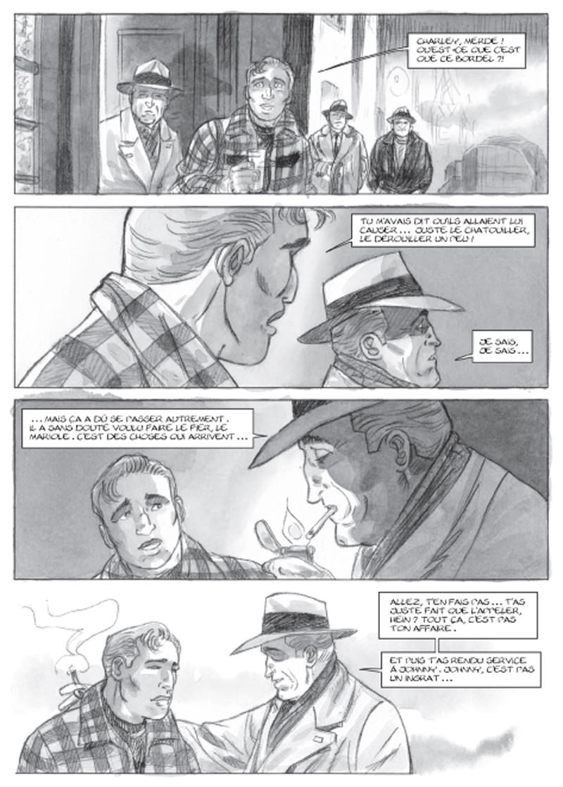 Une nouvelle adaptation réussie pour la collection Rivages / Noir de Casterman. Même si je trouve ce one-shot moins bon que Shutter Island ou Pauvres zhéros, je reconnais avoir passé un bon moment de lecture. On retrouve ici toute cette ambiance de récit de gangster, cet environnement mafieux, ces expéditions punitives criminelles, qui me plaisent tant. Je n’ai pas vu le film de 1955 avec Marlon Brando mais je l’ai facilement imaginé en lisant l’histoire. Certains personnages semblent vraiment réels ; un point d’honneur est mis sur le naturel des dialogues et sur le caractère humain de la psychologie des intervenants. Les dessins sont bons, sans être exceptionnels. Le noir et blanc est par contre bien adapté et apporte cette touche « vieux films noir et blanc » aux planches. En conclusion, cet opus est bon mais il manque cette originalité qui le ferait passer de « sympa » à « génial ».