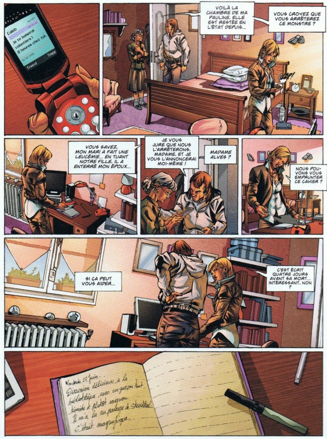 Le dessin, rien à dire, c'est du Defali, fidèle à son style caractéristique, avec des visages toujours un peu bizarres par endroits, et avec des décors parisiens reconnaissables. J'ai noté une application plus nette dans son dessin, même si on sent toujours un travail rapide ; je ne sais pas comment il fait pour arriver à produire autant sur différentes Bd, il est presque aussi prolifique que Griffo à une époque. Le titre rappelle le film de Brian De Palma, mais il s'en écarte heureusement, je n'aurais pas continué si Corbeyran parfois enclin à repomper des trucs, avait fait du copié-collé. On s'attend quand même à voir du glauque relié au sexe, bref des choses un peu tordues. Il n'empêche que ce genre d'intrigue sur les serial-killers commence à devenir assez usée, on a presque tout vu en la matière depuis le Silence des agneaux, et en BD, on ne compte plus les essais dans le genre. On se retrouve donc avec pas mal de situations déjà vues, des poncifs inévitables, mais aussi plein de trucs qui ne sont pas expliqués, notamment les livres découpés ??? de même que j'ai trouvé la fin un peu plate. Je me demandais aussi ce que ces prologues avaient comme intérêt et surtout comme rapport avec l'intrigue principale, c'est à la fin qu'on s'aperçoit de leur signification, le procédé a été également utilisé au cinéma, sauf que là, les auteurs ont merdé dans les prénoms : quand elle est gamine, la fille s'appelle Alice, et quand elle est adulte, c'est Patricia... faudrait quand même faire gaffe à ce niveau à pas commettre de telles erreurs, surtout dans ce genre d'histoires policières qui souvent se révèlent déjà assez compliquées. Les erreurs ça arrive, mais quand on publie pour être lu, ça doit être éradiqué, que font les comités de lecture ? En dépit de pas mal de défauts et de clichés inhérents à ce type d'enquête, la lecture n'est pas foncièrement déplaisante, on ne va pas grimper aux rideaux, mais on ne va pas cracher dessus non plus...