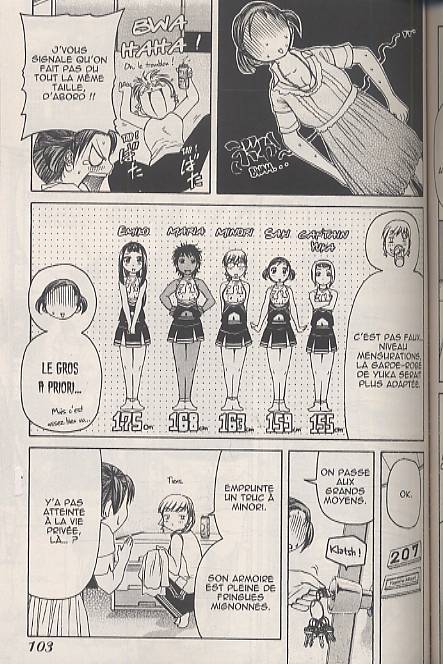 Bon, c'est clair que le but de ce manga est de montrer à la moindre occasion les culottes des pom-pom girls, avec des morceaux de seins par moments. Cabrioles, douches, état d'ébriété, toutes les occasions sont bonnes. De ce côté-là, le fan service est assuré et assumé. Les filles sont girondes, les situations sujettes à de nombreux quiproquos, le personnage masculin sans le moindre intérêt, c'est typique. Je me suis pas mal ennuyé à cette lecture, malgré le trait loin d'être désagréable.