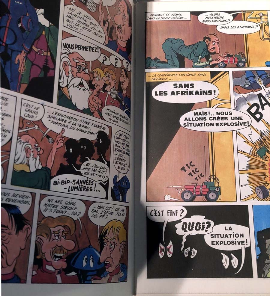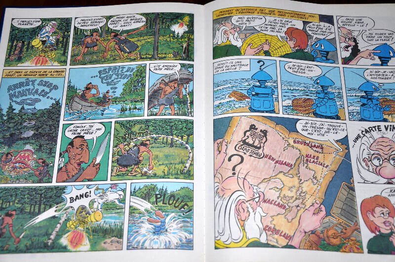 Il y a des jours comme ça où c'est le pont du 14 juillet, on ne travaille pas et il fait un beau soleil, et là soudainement on a envie de poster sur BDT une oeuvre suprême découverte pendant ses dernières vacances, j'ai nommé Nostrabek. J'ai eu la chance de tomber sur un résumé de l'histoire, ce qui m'enlève la désagréable activité d'en faire un moi-même, auprès du site de la République Libre qui héberge les connaissances de Patrick Couture sur la bande dessinée québécoise. Ce site sent fort le nationalisme québécois, mais j'en remercie son auteur car j'aurais été assez peu capable de faire aussi bien. Nous sommes donc dans le futur, quelque part au Québek (et non au Québec, eh oui l'évolution de la langue a fait son oeuvre), et nous faisons la délicate rencontre du professeur Nostrabek et de l'équipage de son vaisseau. Le genre est axé sur la science-fiction avec des idées sur le nouvel ordre mondial de dans 200 ans somme toute pas plus débiles que dans d'autres séries du 9ème art que je ne citerai pas, Sillage par exemple, ah mince je l'ai dit. Mais le parti de l'humour et de la caricature sont également pris. Certains personnages ont des têtes de personnalités connues du 20ième siècle. Nostrabek est entouré de personnages qui ne l'aident pas dans sa tâche de sauver la Terre si je résume dans les grandes largeurs. Je dois avouer que je n'ai pas été emballé plus que ça par ma lecture, l'intrigue ne tient pas en haleine, mais je ne doute pas que cela puisse être apprécié par un garçonnet de 10 ans qui lirait cela dans son grenier poussiéreux. Le dessin n'est pas franchement beau, les couleurs font un peu mal aux yeux, mais reconnaissons qu'il n'est pas laid (de même que Katmandou d'ailleurs). Je me rappelle qu'en quatrième de couverture était annoncée une suite (2 albums même si ma mémoire est bonne, l'auteur avait de l'ambition) sur les aventures extraordinaires de Nostrabek et sa smala mais dans un univers différent. Il semblerait à en croire mes recherches sur la toile qu'aucun autre album ne vit le jour, et c'est fort dommage...