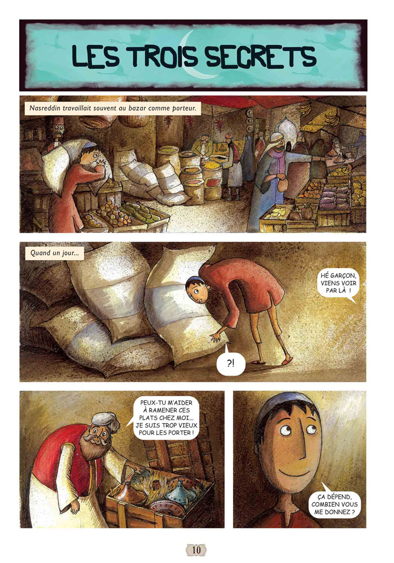 Autant j'ai été séduit par les Contes asiatiques de la même collection chez le même éditeur, autant je reste plus réservé et un peu déçu au sortir de cette lecture. Tout d'abord au niveau mise en forme. J'avais apprécié que chaque conte asiatique soit présenté comme un conte de tel ou tel pays, ici rien de tel. Ensuite, l'autre album se terminait par une double page documentaire sobre et suffisamment longue. Là, cela varie jusqu'à 6 pages et je trouve que cela casse le rythme de lecture entre chaque conte et je ne suis pas sûr qu'un enfant prendra le temps de lire toutes ces informations pourtant intéressantes et adaptées à un jeune public. Ensuite, si j'ai apprécié de retrouvé des personnages de contes arabes connus tels que Nassredin, j'ai trouvé que la plupart des contes étaient traités plus rapidement, étant parfois même plus courts que les pages documentaires qui suivent. Enfin, si j'avais vraiment apprécié le dessin de certains contes asiatiques, j'avoue que dans ce recueil, aucun ne m'a véritablement enthousiasmé. C'est simple et les histoires sont lisibles, mais tout ça manque tout de même de caractère.