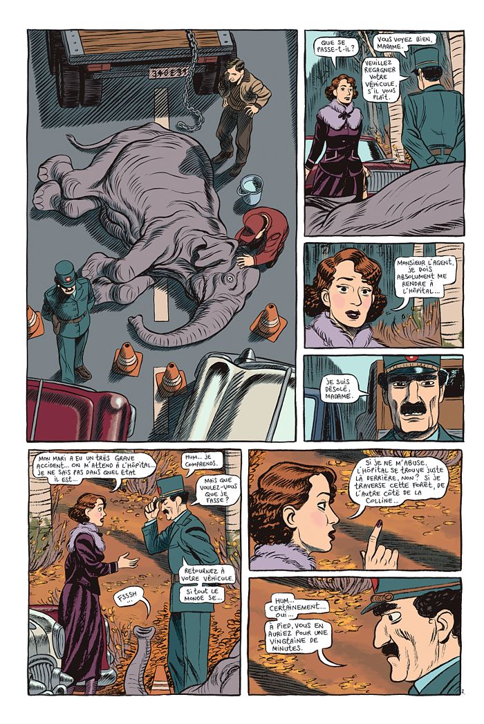 Je ne me risquerai pas à faire l’exégèse complète de cet album, une telle tâche s’avérerait certes passionnante mais assez fastidieuse, tant il y a matière à interprétation. Une fois encore, Frederik Peeters nous entraîne dans un univers fantastique bien à lui, avec ses propres codes, où il est parfois difficile de différencier la réalité du rêve. Déjà ce titre singulier. Le pachyderme en question ne fait qu’une brève apparition au début dans la scène de l’accident. Image terrible : on y voit le regard paniqué de l’animal révélant une âme prise au piège d’un corps trop lourd pour se relever de lui-même. Et on le retrouve à plusieurs reprises sous forme de pendentif indien, lequel semble si pesant au cou de la belle Carice, figée en pleine chute sur la couverture. La jeune femme, en plein questionnement existentiel, prend conscience qu’elle a renoncé à ses rêves de pianiste concertiste pour vivre une existence bourgeoise et ennuyeuse dans l’ombre de son mari fortuné. Le monde lui devient étranger, et à la façon d’une Alice grandie trop vite, Carice (synthèse d’Alice et Caprice ?) va entrer contre son gré dans un univers où les merveilles apparaissent plus inquiétantes que merveilleuses, mais salutaires sans doute. Côté dessin, rien à redire, on retrouve la maîtrise à laquelle nous a habitué l’auteur suisse, avec un trait unique capable de faire le va-et-vient entre réalisme et onirisme débridé. Les couleurs sont recherchées, avec une dominante cosy saupoudrée de teintes acides, induisant cette notion de confort menacé quelque peu perturbante. Bien sûr, il y a des tas de choses qui m’ont échappé, et j’ai dû le relire au moins une deuxième fois pour mieux cerner cet objet très zarbi, bien mieux construit qu’il n’y paraît, mais je l’ai fait sans me sentir contraint. L’histoire est tellement fascinante qu’on la lit un peu à la manière d’un jeu de pistes lynchien. De toute évidence, cette BD n’a pas pour objet de distraire mais elle le fait quand même grâce à cet aspect envoûtant qui permet aussi d’exiger la participation active du lecteur. Tel un récit-miroir qui parle à l’âme, ce Pachyderme tente de nous égarer dans sa jungle luxuriante pour mieux provoquer la panique en nous, comme pour son héroïne sur le fil du rasoir, mais au final récompense notre persévérance d’être allé jusqu’au bout en nous conférant un supplément de légèreté… Une production qui pour moi conforte Frederik Peeters comme un des auteurs les plus originaux et les plus passionnants de sa génération.