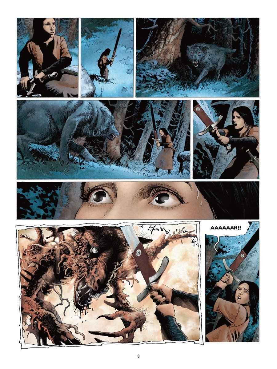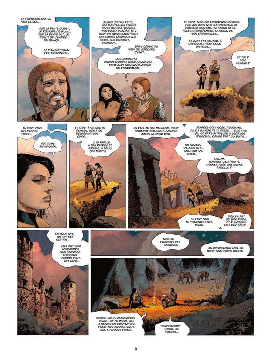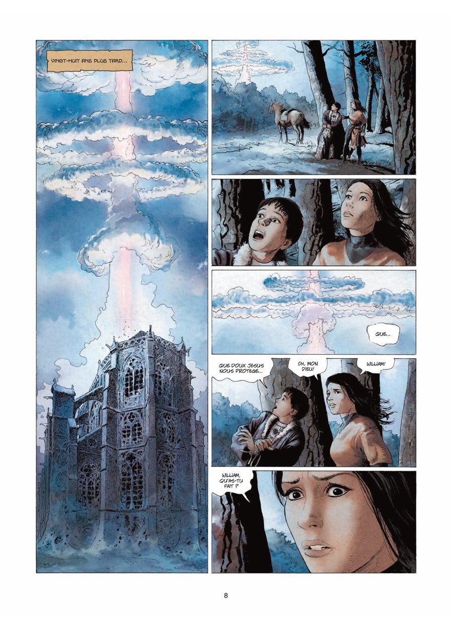 Je n’ai pas été enthousiasmé plus que ça par la lecture de cette série, mais elle possède quand même suffisamment de qualités pour que je la recommande quand même aux amateurs du genre. Le cadre général dans lequel se développe l’intrigue est relativement original. En effet, les séries usent parfois d’un univers entièrement inventé, quand d’autres s’ancrent dans un moyen-âge fidèle à la réalité. Ange a pris le parti d’un entre-deux en ce domaine. Les vêtements (un peu moins les armures) font penser au XVème siècle. L’intrigue se situe en Europe, surtout dans une France ici présentée comme un Empire de France dominant l’Europe. Autre pas de côté, des villages des Vosges (d’où est originaire Marie, l’héroïne) ressemblant plutôt à ceux qu’on rencontre dans les sud-ouest. Et un « ordre de Cluny » ressemblant à celui des Templiers, qui plus est au moment (XVème siècle donc ?) où Cluny avait depuis pas mal de temps perdu de sa superbe. C’est un peu perturbant pour qui connait l’Histoire, mais ça donne finalement une patine intéressante au récit. L’entame du récit est assez classique, avec un massacre violent, auquel la jeune Marie échappe. La suite part sur une vengeance, là aussi classique, mais va en partie s’écarter de ce schéma, le fantastique s’invitant de façon intermittente dans le récit. On a parfois du mal à s’attacher aux personnages, en particulier les « méchants », rapidement éliminés. Mais il y a des longueurs dans le récit, et les « bestioles » maléfiques » sont bizarres, leur forme improbable (avec une créature aux faux airs d’Alien !) contraste avec le réalisme du reste (décors et personnages), et l’aspect ésotérique m’a échappé – en tout cas ne m’a pas captivé. Le côté fantastique – voire SF – est trop présent sur la fin (dernier tome surtout) à mon goût, le mélange des genres passe ici moins bien que sur Thorgal par exemple (à bien des égards, Marie est une sorte de mixe de Thorgal et de Jeanne d’Arc – est-ce son village des Vosges qui m’y a fait penser ?). Le dessin est plutôt bon et agréable. La colorisation lisse parfois un peu trop les nuances, mais le rendu global est plaisant, adouci.