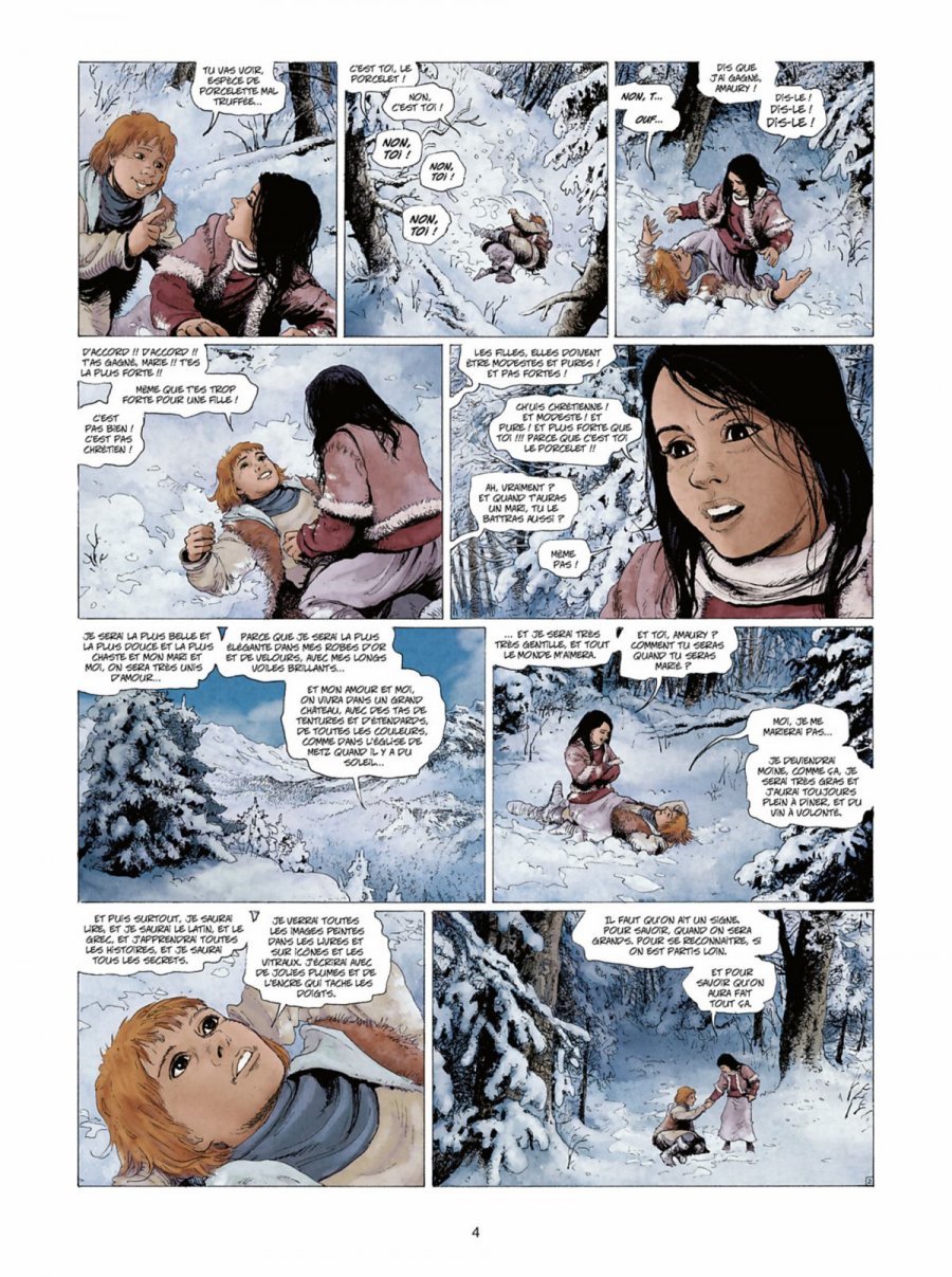 J'ai repéré cette série grâce à BDT et à ses couvertures attirantes (exceptée celle du tome 5), et du coup j'ai lu les 5 tomes d'affilée. En ouvrant la première page, je crois reconnaître sur une belle image un village célèbre que j'ai souvent visité, ça a tout d'un paysage caussenard ou du Lot, en fait c'est inspiré du village de Conques en Aveyron, avec sa belle abbatiale aperçue en page 12 ; car on apprend plus tard que ce village (celui de Marie) est censé se trouver dans les Vosges. J'ai vite compris que les auteurs avaient recrée une France médiévale parallèle et imaginaire, un Empire, et transposé des lieux connus dans d'autres endroits ; Démarez réussit grâce à son dessin très élégant à reproduire plusieurs monuments et châteaux célèbres qui portent des noms différents. Ainsi, on a la Cité de Carcassonne qui figure la forteresse assiégée de Bayeux, j'y ai reconnu le château de Josselin en Bretagne et un style de maisons quercynoises bien restituées mais qui sont situées ailleurs. Cet univers où la France moyenâgeuse n'est pas celle que l'on connaît, utilise quand même des noms de rois et princes français mais d'un autre univers ; il est question de l'abbaye de Cluny, du roi d'Angleterre Edouard III, et les armures et costumes sont clairement du XVème siècle. Tout ce mélange déstabilise un peu le passionné d'Histoire médiévale que je suis, mais je le trouve intéressant. Cet univers est bien élaboré, le personnage de Marie et celui de William sont bien travaillés, de bonnes scènes de combat souvent sanglantes pimentent cette aventure. Ma lecture fut cependant contrariée. Ce que j'ai beaucoup moins aimé, c'est le fantastique qui va avec, je le trouve inapproprié, il ne cadre pas trop avec l'ensemble et avec la vision du médiéval fantastique que j'en ai. Je trouve ces bestioles rampantes ridicules et grotesques, et le gros monstre ressemble à l'extraterrestre d'Alien en plus granguignolesque. Cet aspect là dessert la série, j'ai l'impression que le scénariste colle du fantastique pour entrer dans cette catégorie de médiéval fantastique, mais de façon maladroite, c'est un peu du n'importe quoi ; je m'attendais plus à voir des dragons dont le titre fait état, mais qui finalement sont absents. Là-dessus, il y a quelques incohérences et des raccourcis qui impriment une progression parfois peu claire. Malgré tout ça, l'ensemble est bien pensé, et le dessin de Démarez est très bon, c'est le grand atout de cette série, mais je m'attendais à mieux..