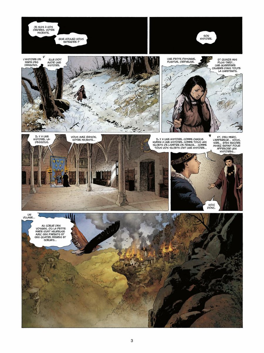 J'ai été très agréablement surpris non seulement par la qualité graphique de cette bande dessinée mais aussi par l'originalité de son scénario. A ce jour, j'ai lu la série jusqu'à son quatrième tome et son niveau reste très bon. Le dessin de Thierry Démarez fait aussitôt penser à celui de Rosinski et de Thorgal. Influence voulue pour une ambiance médiévale fantastique assez proche. Seules les couleurs, un peu plus vives, modifient légèrement l'atmosphère visuelle. Quoiqu'il en soit, c'est très plaisant à lire et à regarder. On croirait retrouver un grand classique de qualité. Malgré la même paire d'auteur, une héroïne guerrière et un titre approchant, Marie des Dragons n'a rien à voir avec La Geste des Chevaliers Dragons. D'ailleurs, de dragons, il n'y en a point. Juste des créatures que l'empereur a nommées ainsi par décret. Parlons-en de l'empereur justement. Il s'agit de l'Empire de France, une France parallèle, imaginaire, sensiblement différente de la France médiévale que l'on connait. Et une grande partie de l'intrigue joue justement là-dessus, sur l'existence de cet Empire de France dont certains habitants réalisent, par des visions, qu'il pourrait bien exister un autre monde, le nôtre, où l'Histoire n'a pas suivi le même cours, où eux-mêmes vivraient une autre vie. Quelle est cette hérésie ? Quel rapport avec ces monstres hideux venus d'ailleurs qui prennent parfois forme et que seuls certains initiés comme Marie peuvent voir et combattre ? Et quel rapport encore entre tout cela et les frères et soeurs de Marie tués ou peut-être enlevés alors qu'elle sortait à peine de l'enfance ? Les énigmes s'amoncellent et captivent le lecteur que je suis. Si bien que malgré un départ qui m'avait fait craindre un scénario de vengeance assez banal, l'intrigue emprunte rapidement un chemin novateur et très intriguant. La narration est bonne, dense et bien construite. Le monde mis en place est crédible et très intéressant. Les personnages sont charismatiques et on a une envie permanente de voir où le récit va les mener car alors même que les tomes avancent, rien n’apparaît comme prévisible ni déjà vu. Une bien bonne surprise avec la possible promesse d'un futur classique de l'heroïc-fantasy.